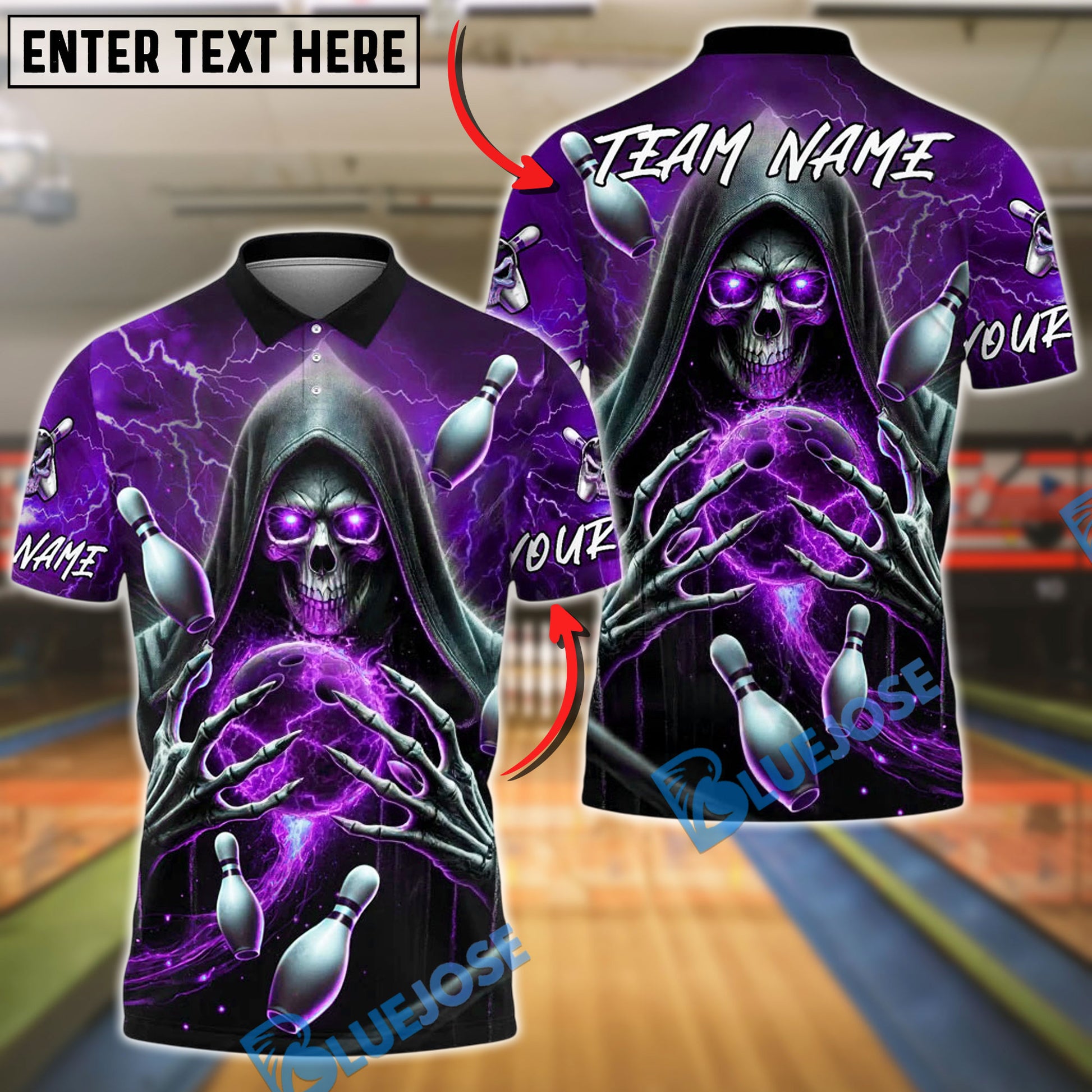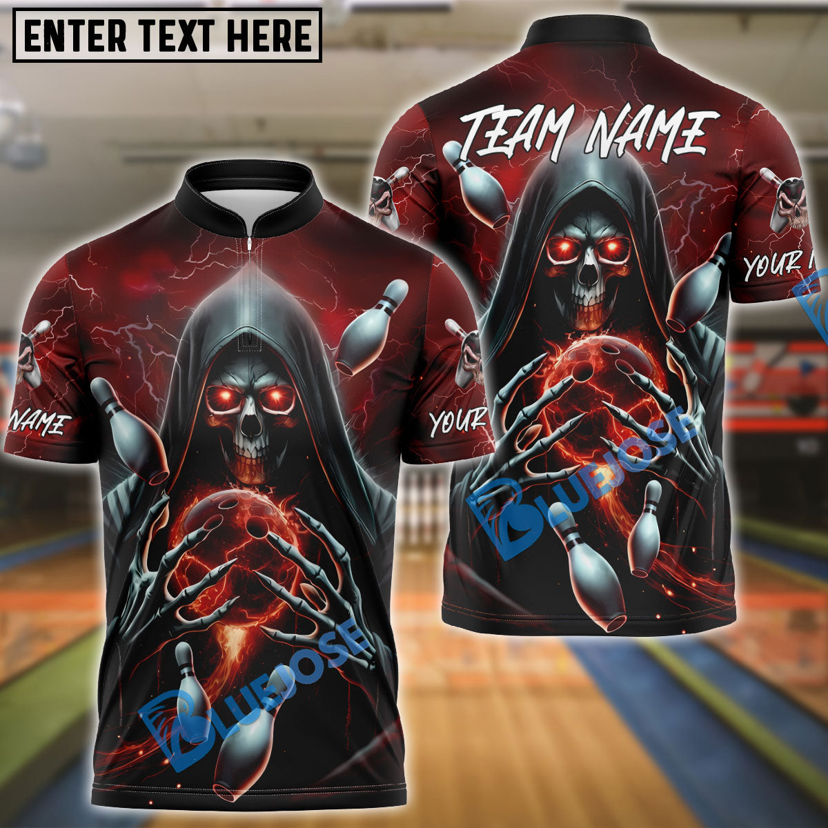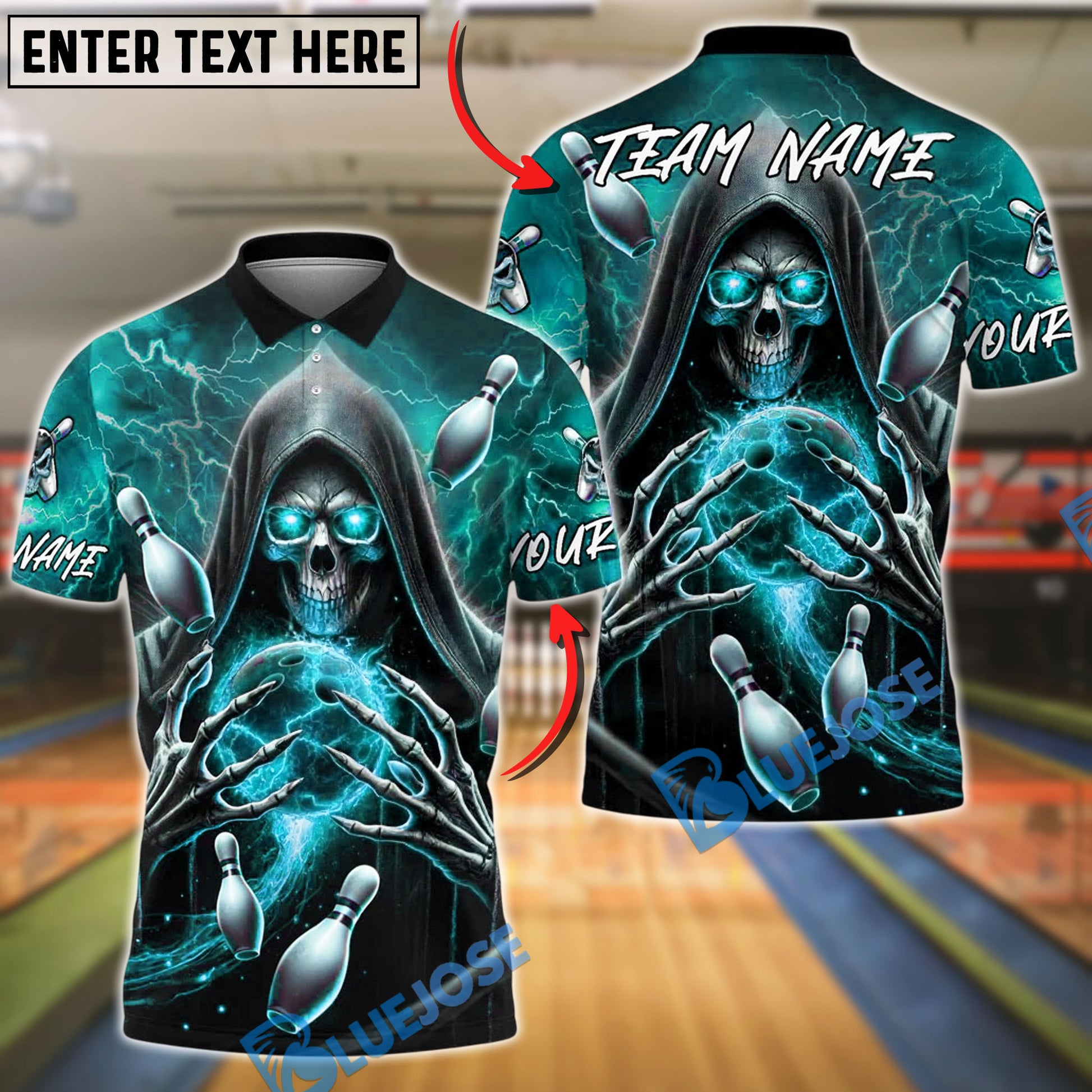 BlueJose Bowling And Pins Skull Grim Reaper Lightning Customized Name, Team Name 3D Shirt (4 Colors)