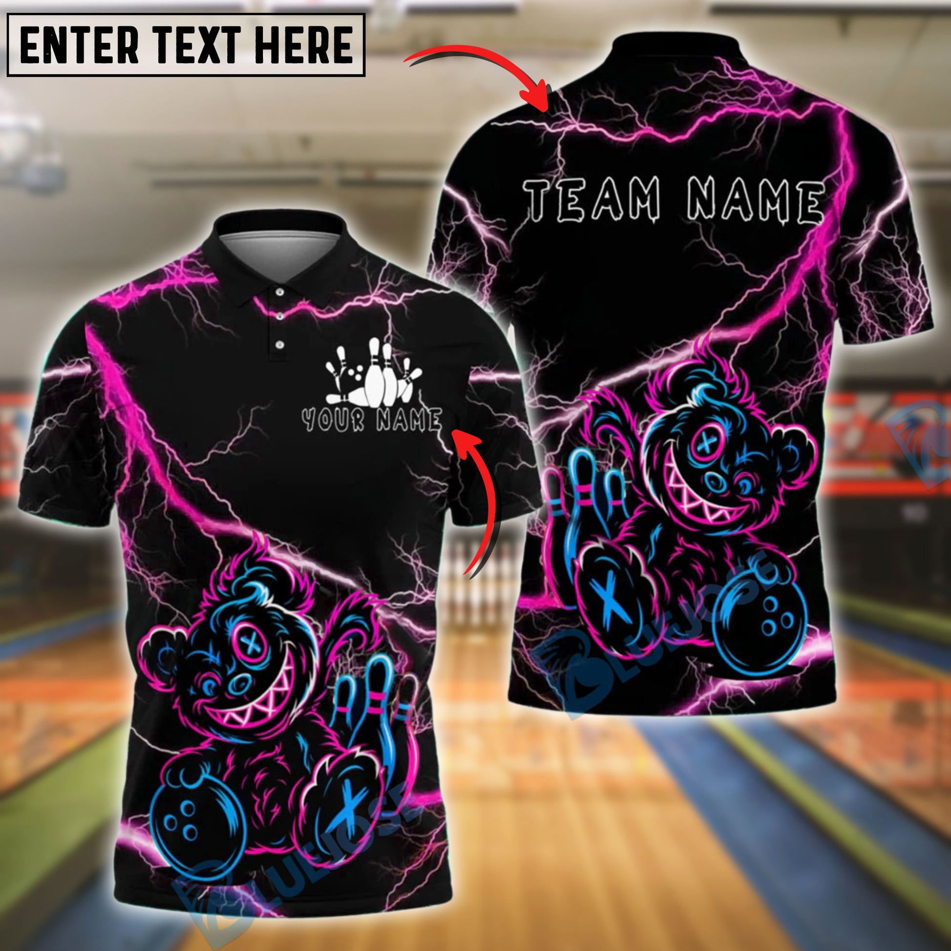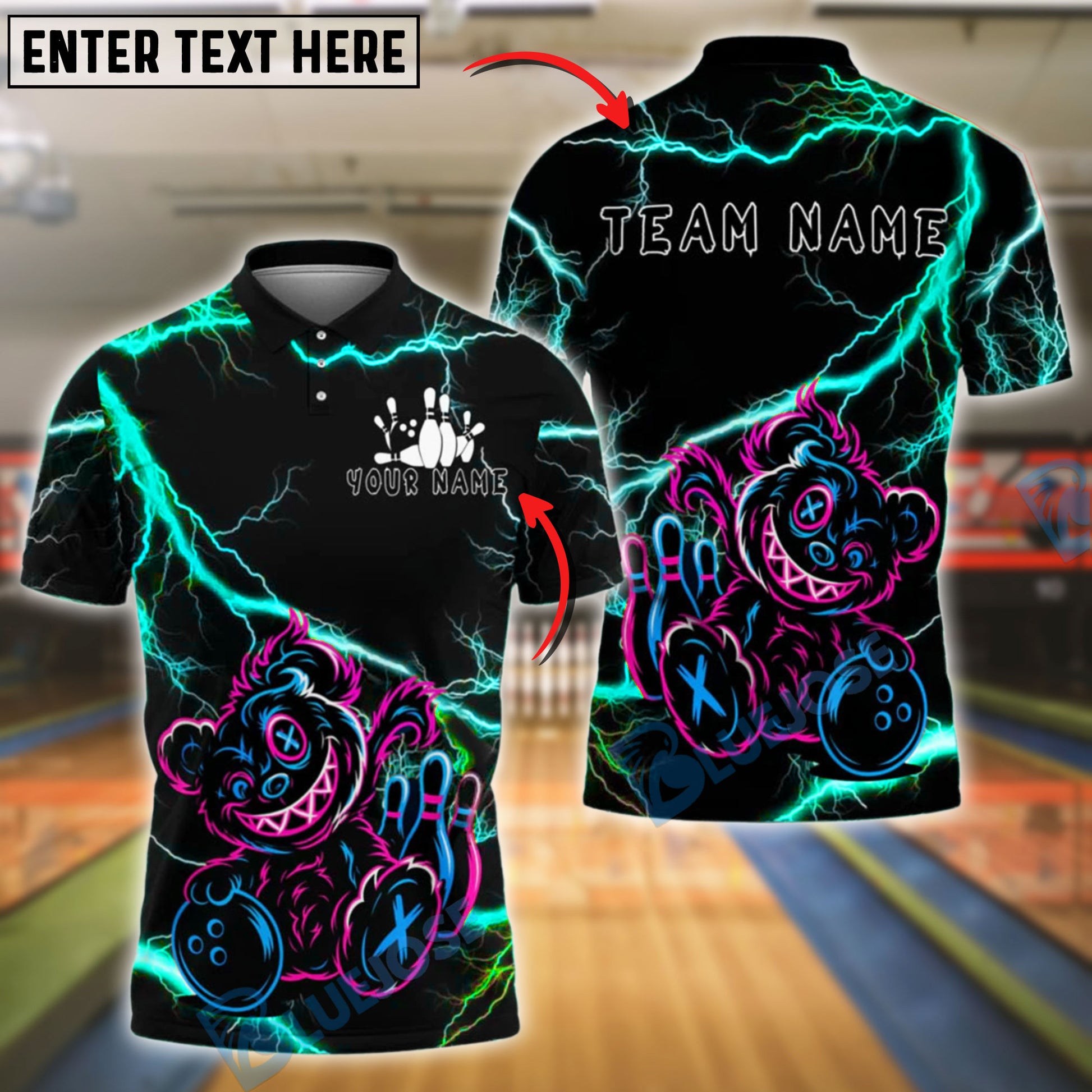 BlueJose Bowling And Pins Teddy Bear Cosmic Cute Customized Name, Team Name 3D Shirt (4 Colors)