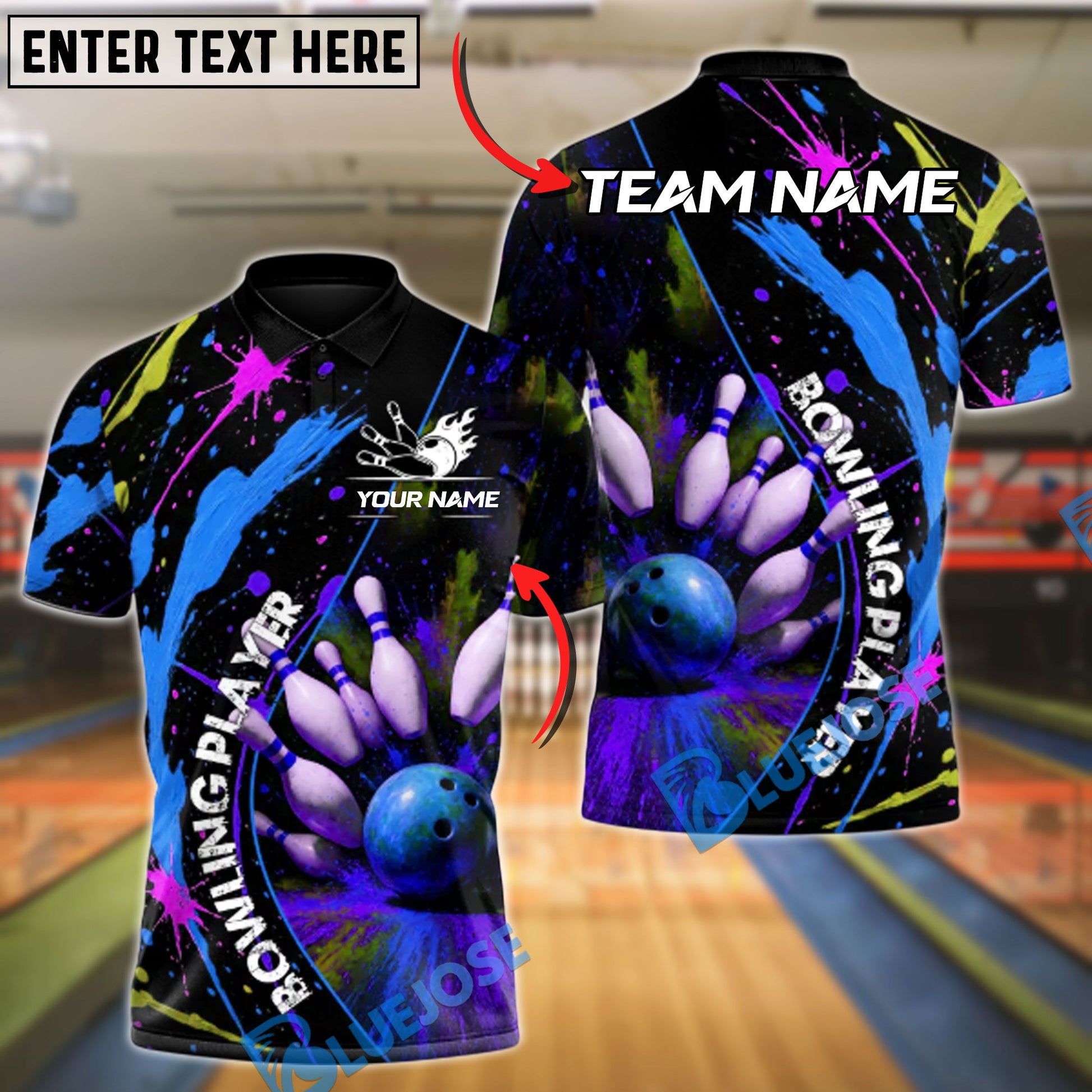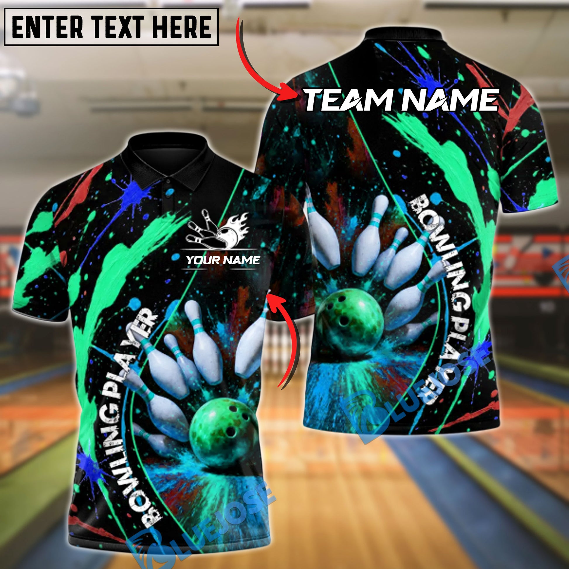 BlueJose Bowling Color Splash Strike Customized Name, Team Name 3D Shirt (4 Colors)