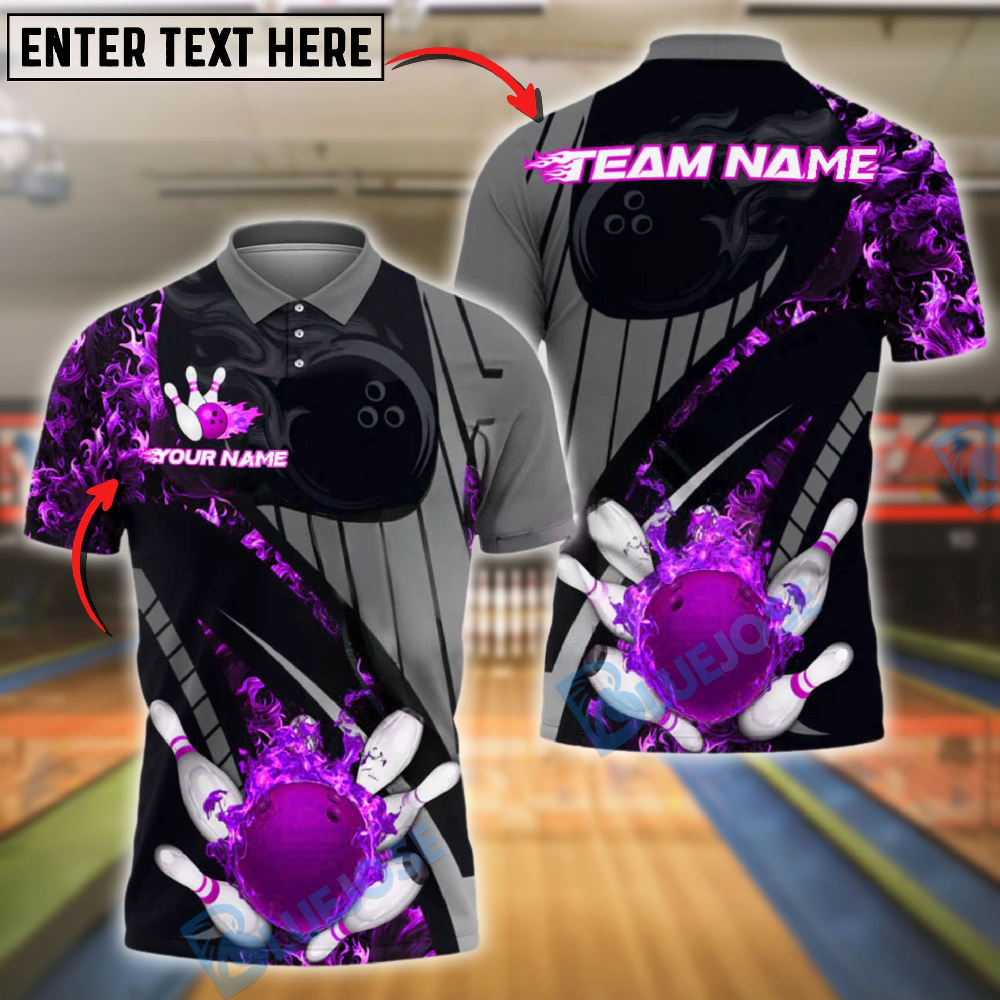 BlueJose Bowling Flaming Ball and Pins Grey Pattern Customized Name, Team Name 3D Shirt (4 Colors)