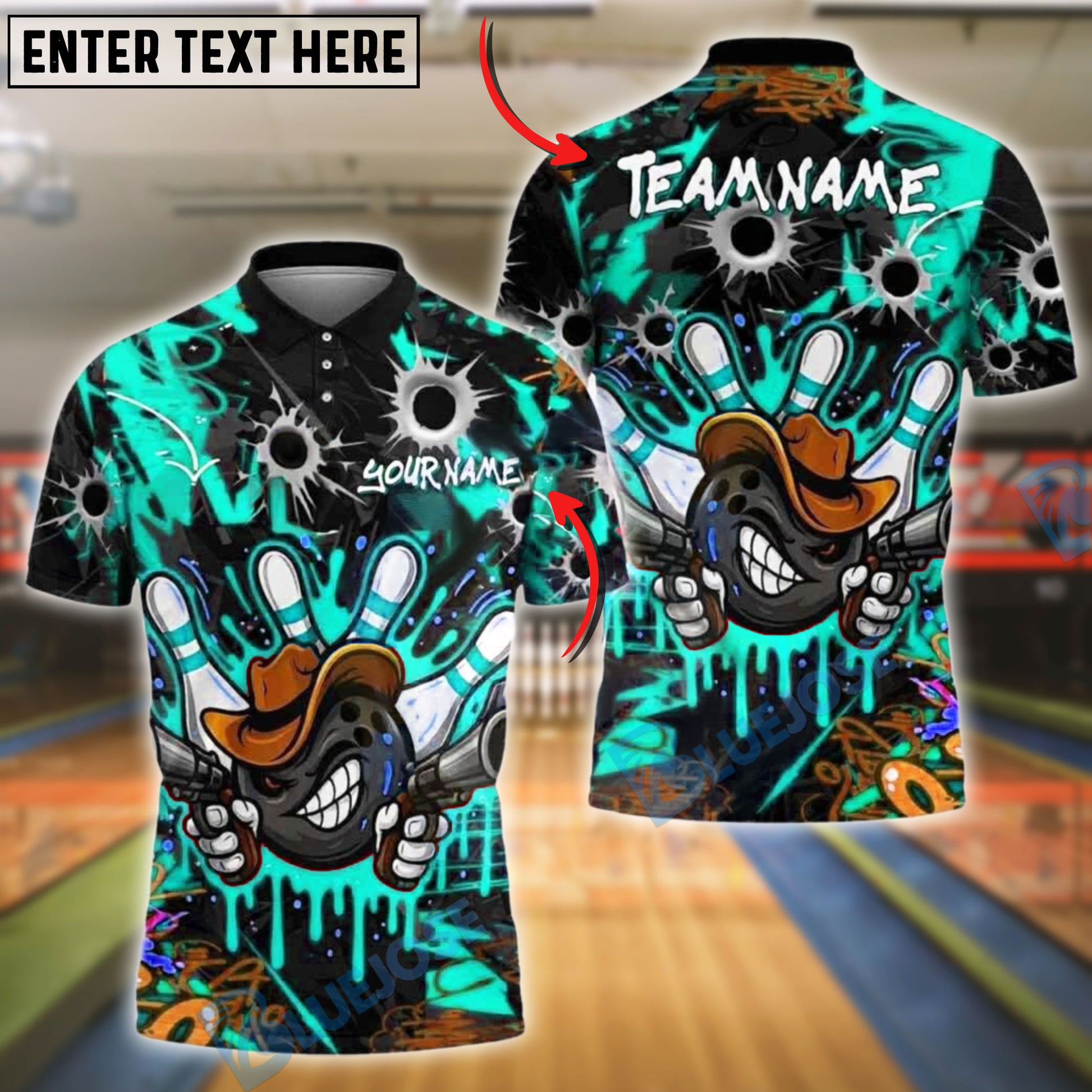 BlueJose Bowling Graffiti Cowboy With Bullet Holes Customized Name, Team Name 3D Shirt (4 Colors)