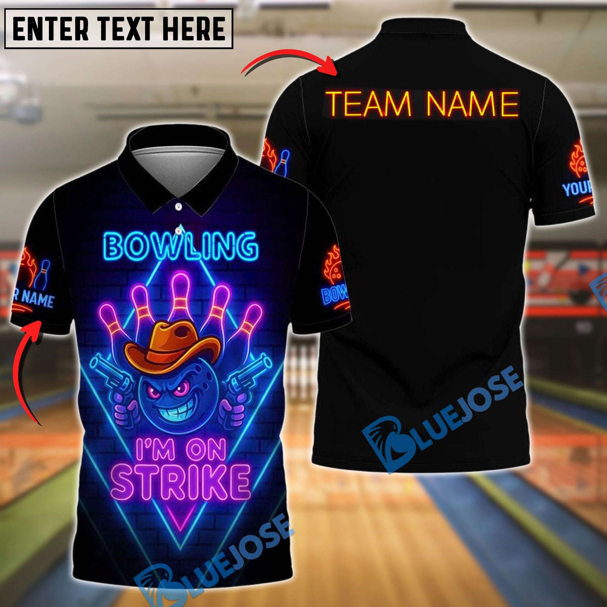 BlueJose Bowling Neon Cowboy Strike Personalized Name, Team Name Unisex Shirt