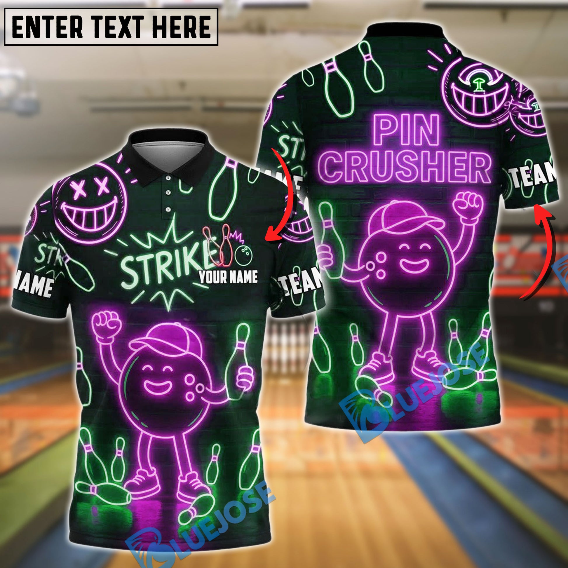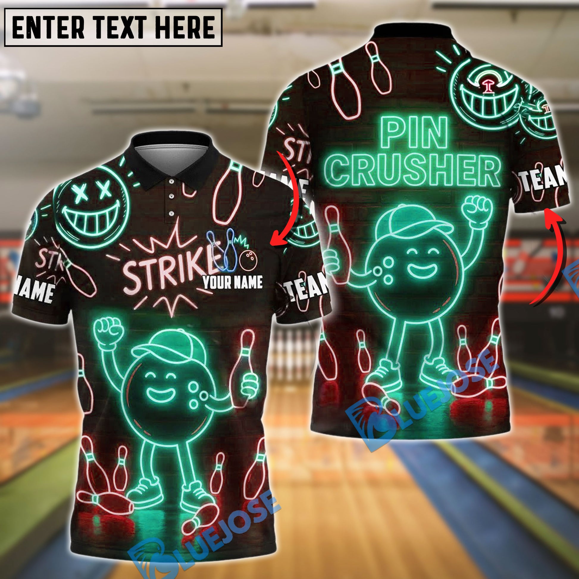 BlueJose Bowling Neon Strike Pin Crusher Style Customized Name, Team Name 3D Shirt (4 Colors)