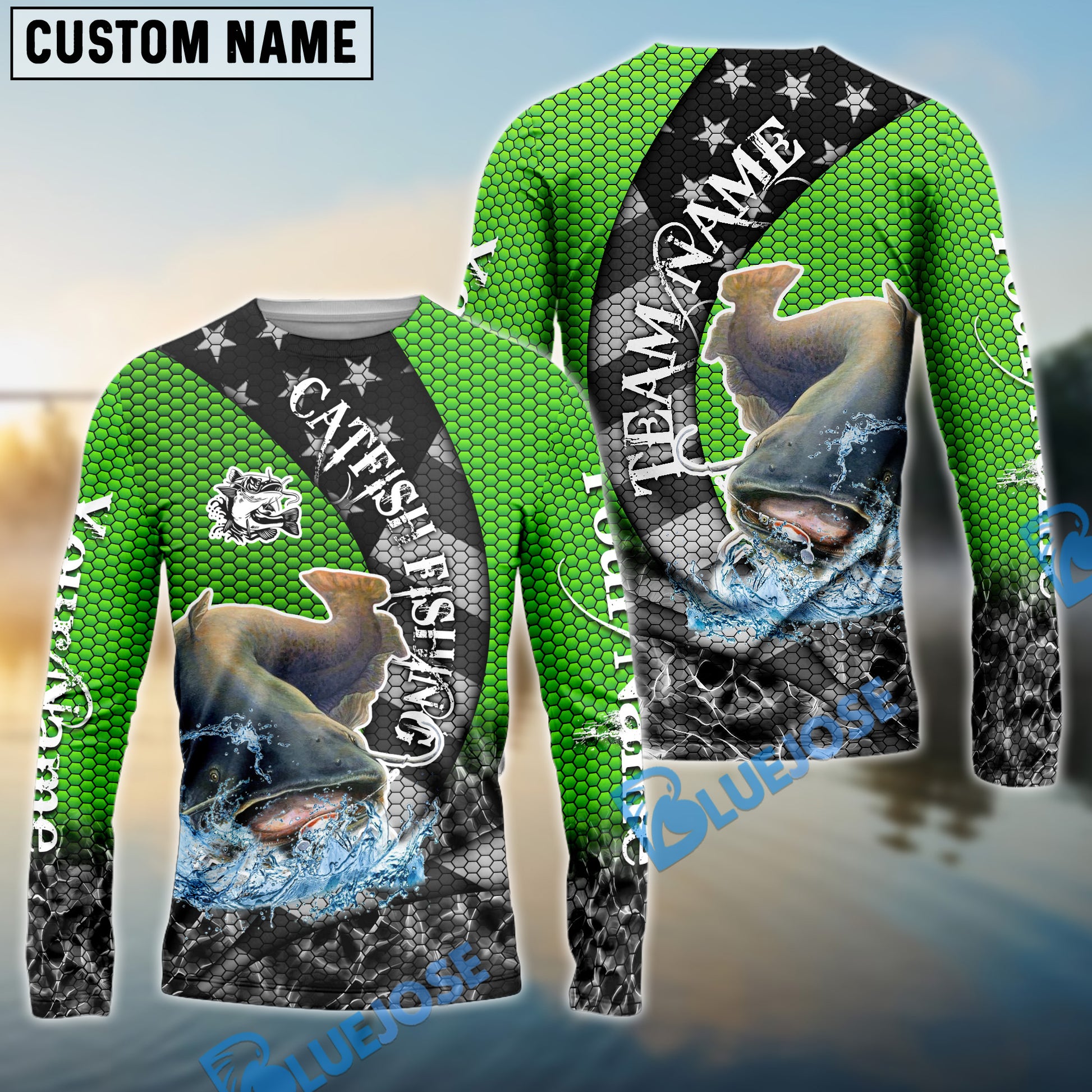 Bluejose Catfish Fishing American Flag Green Stars Custom Name & Team Name 3D Shirts