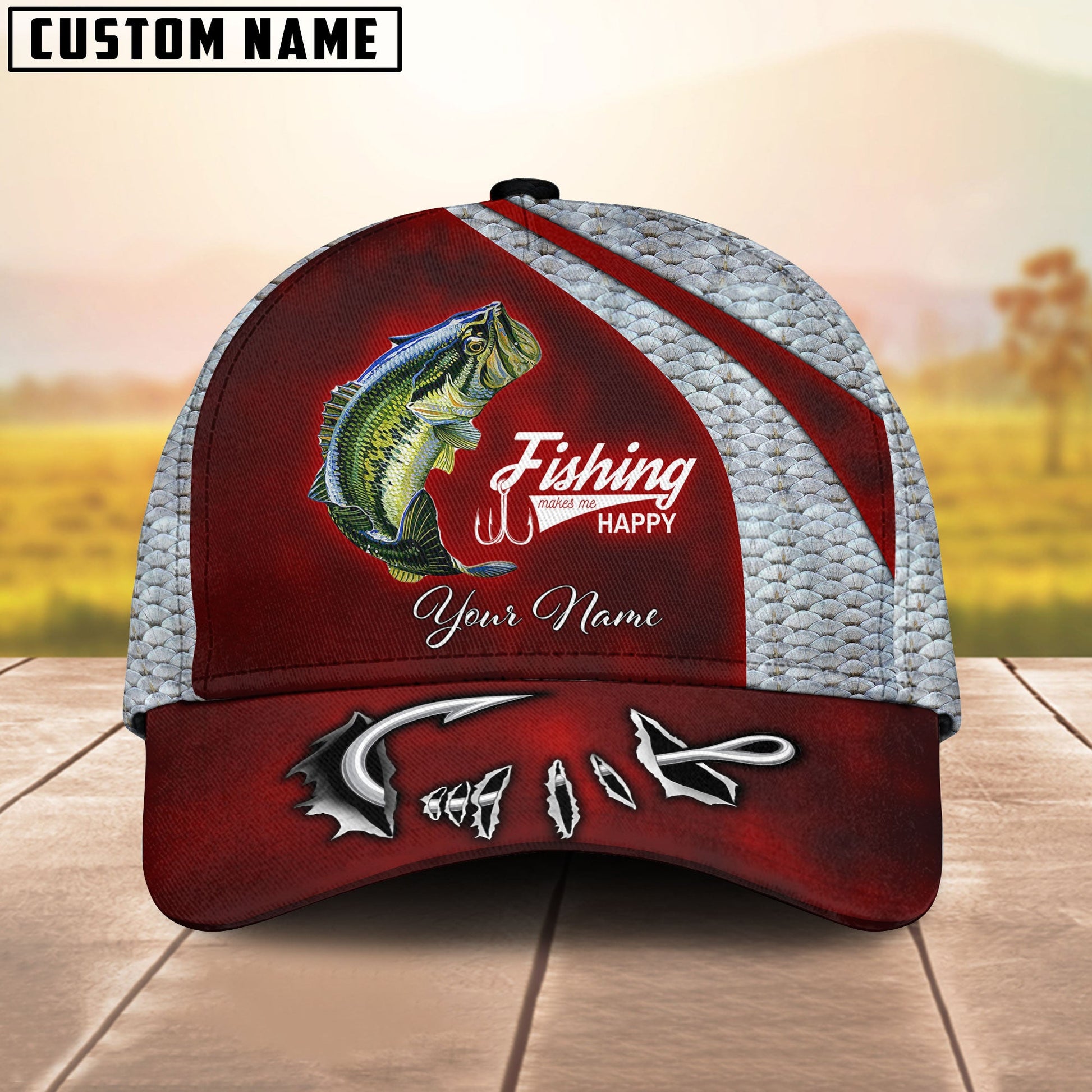 BlueJose Custom Name Bass Fishing Red Hat Hook Print Cap