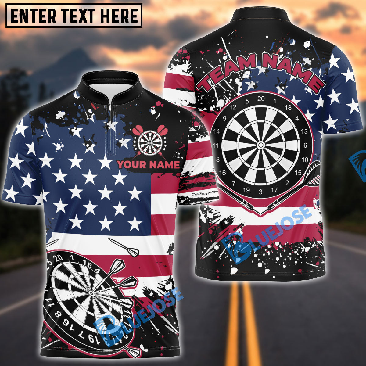BlueJose Darts American Flag Grunge Paint Splash Patriotic Personalized Name, Team Name Shirt