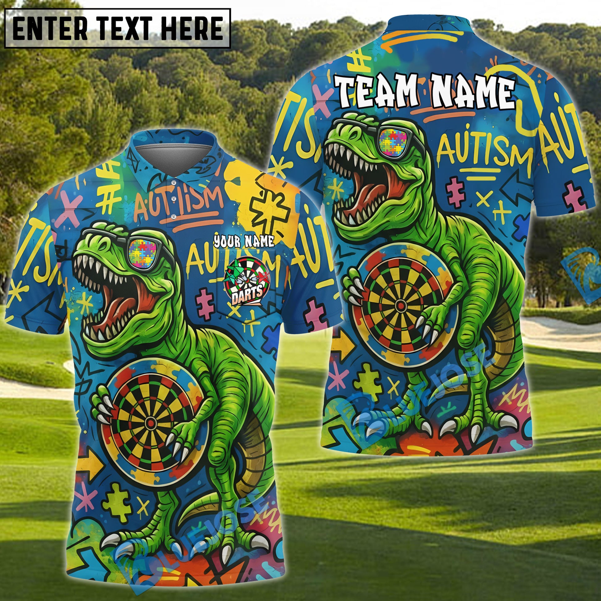 BlueJose Darts Autism Awareness T-Rex Graffiti Personalized Name, Team Name Shirt