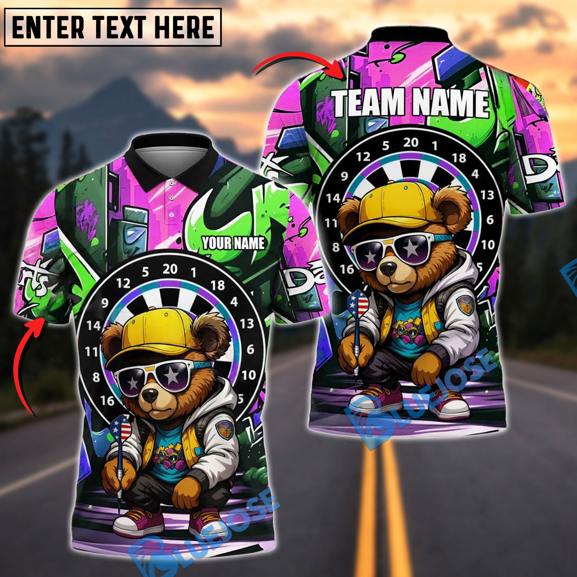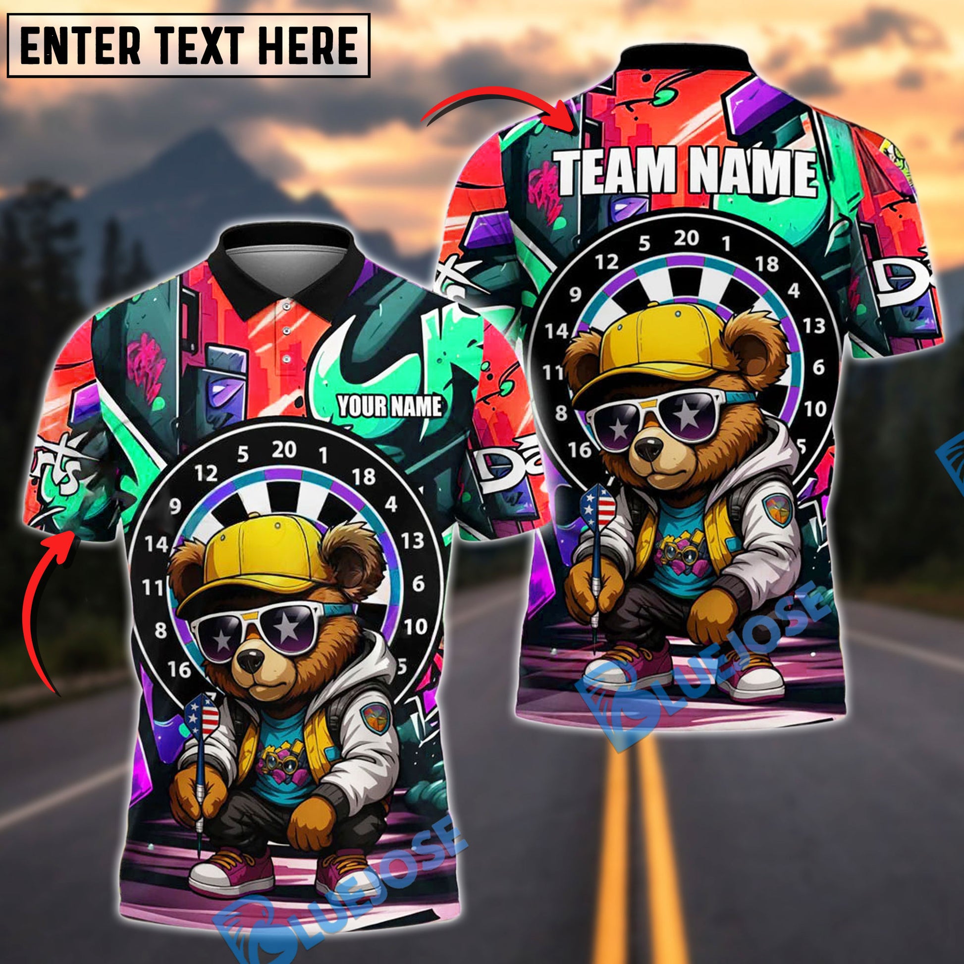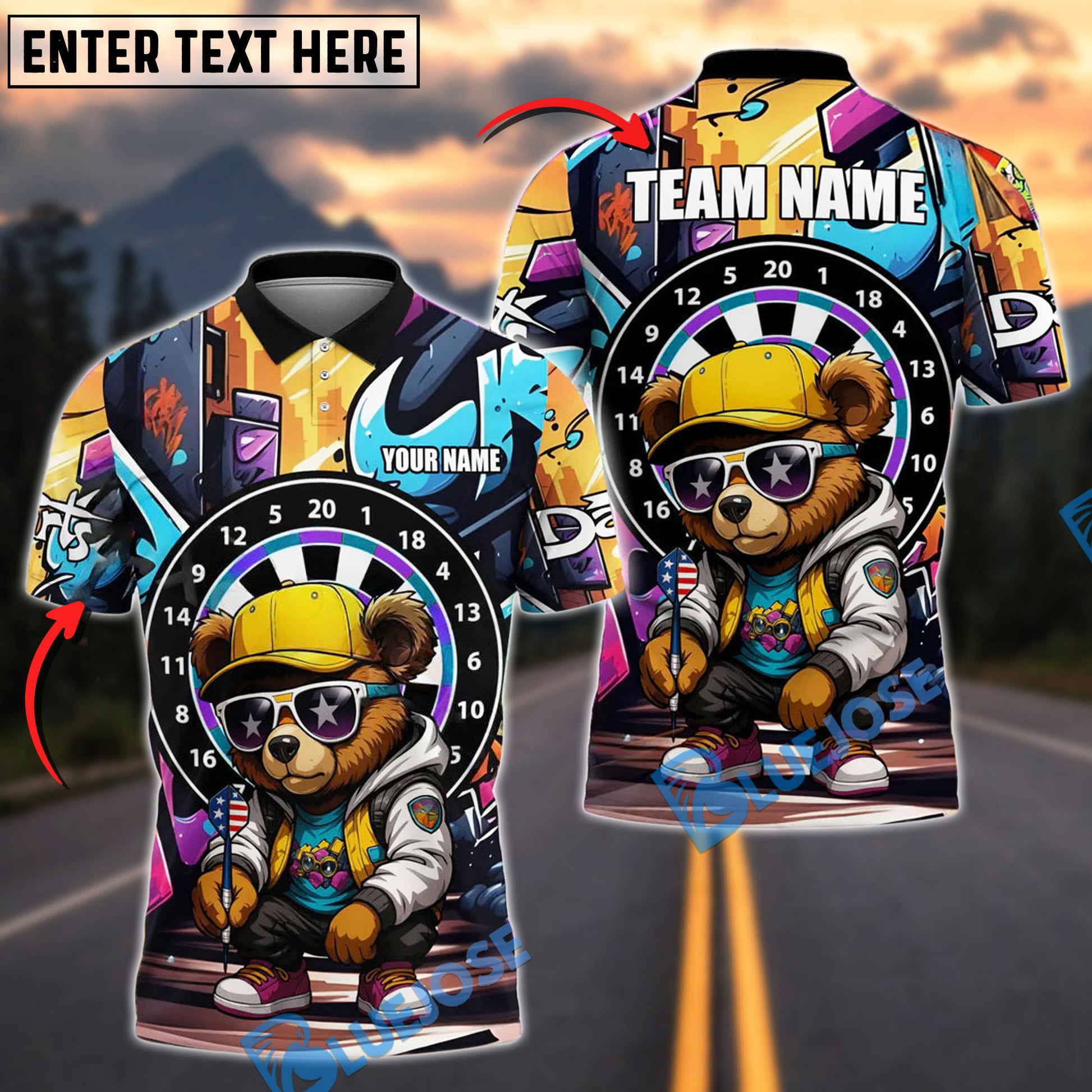 BlueJose Darts Bear Cool Urban Personalized Name, Team Name Shirt (4 Colors)