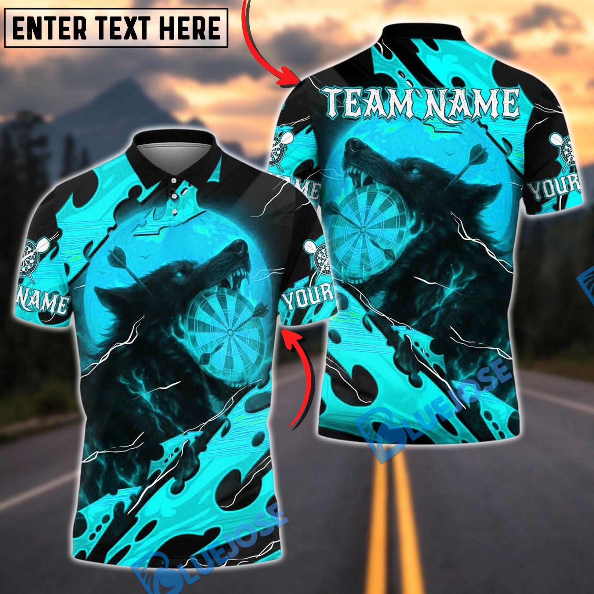 BlueJose Darts Black Fire Wolf Moon Target Personalized Name, Team Name Unisex Shirt (4 Colors)