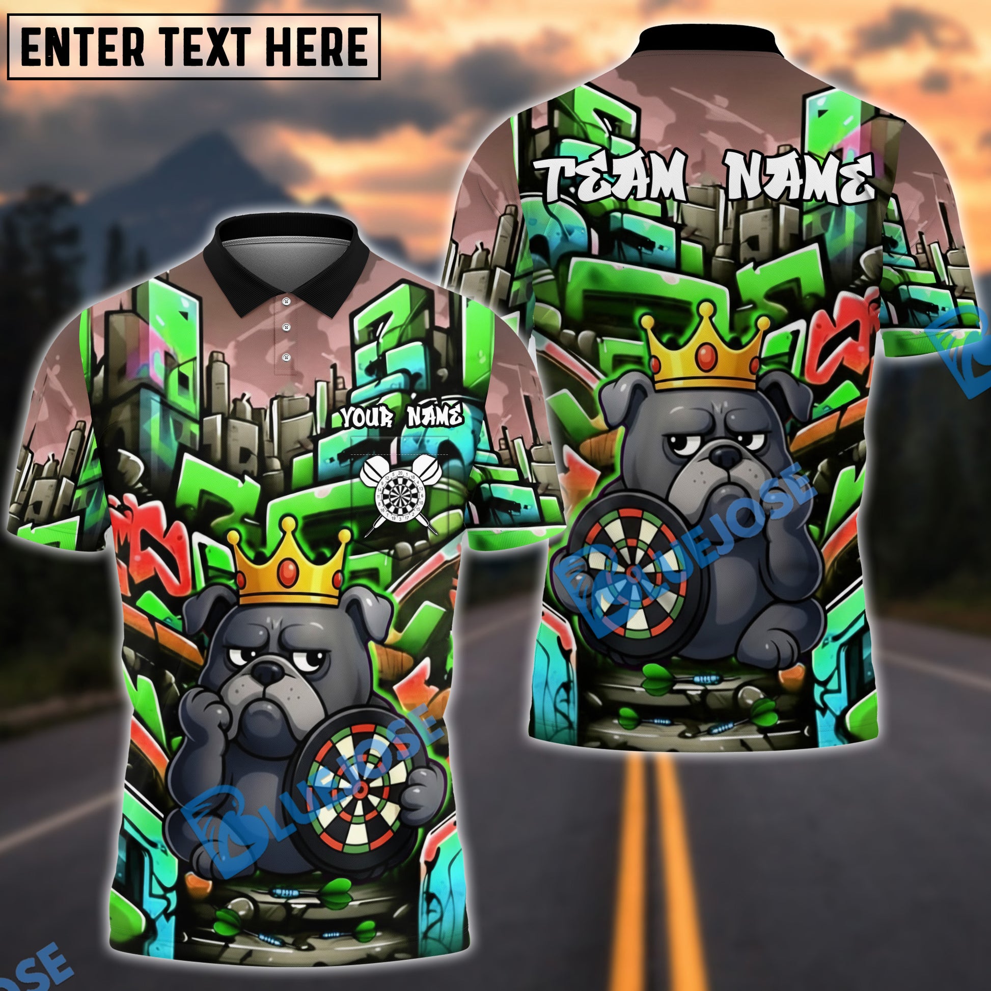 BlueJose Darts Bulldog King Graffiti Crown Customized Name, Team Name 3D Shirt (4 Colors)