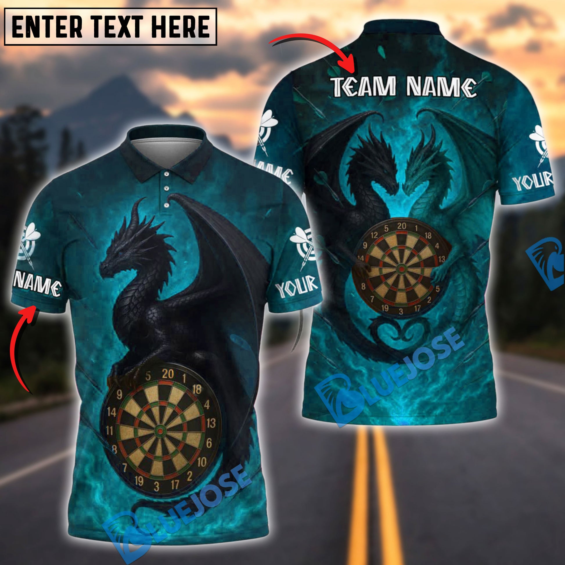 BlueJose Darts Dark Twin Dragon Fantasy Style Personalized Name, Team Name Shirt (4 Colors)