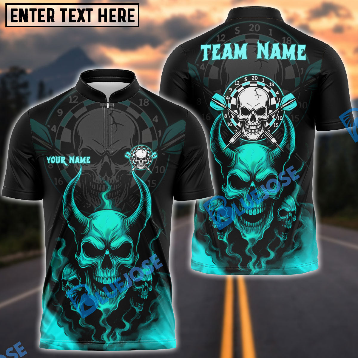 BlueJose Darts Demon Skull Fire Personalized Name, Team Name Shirt (4 Colors)