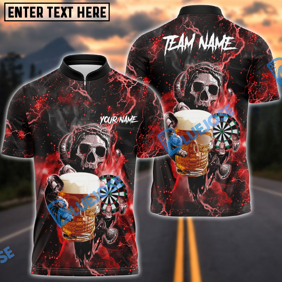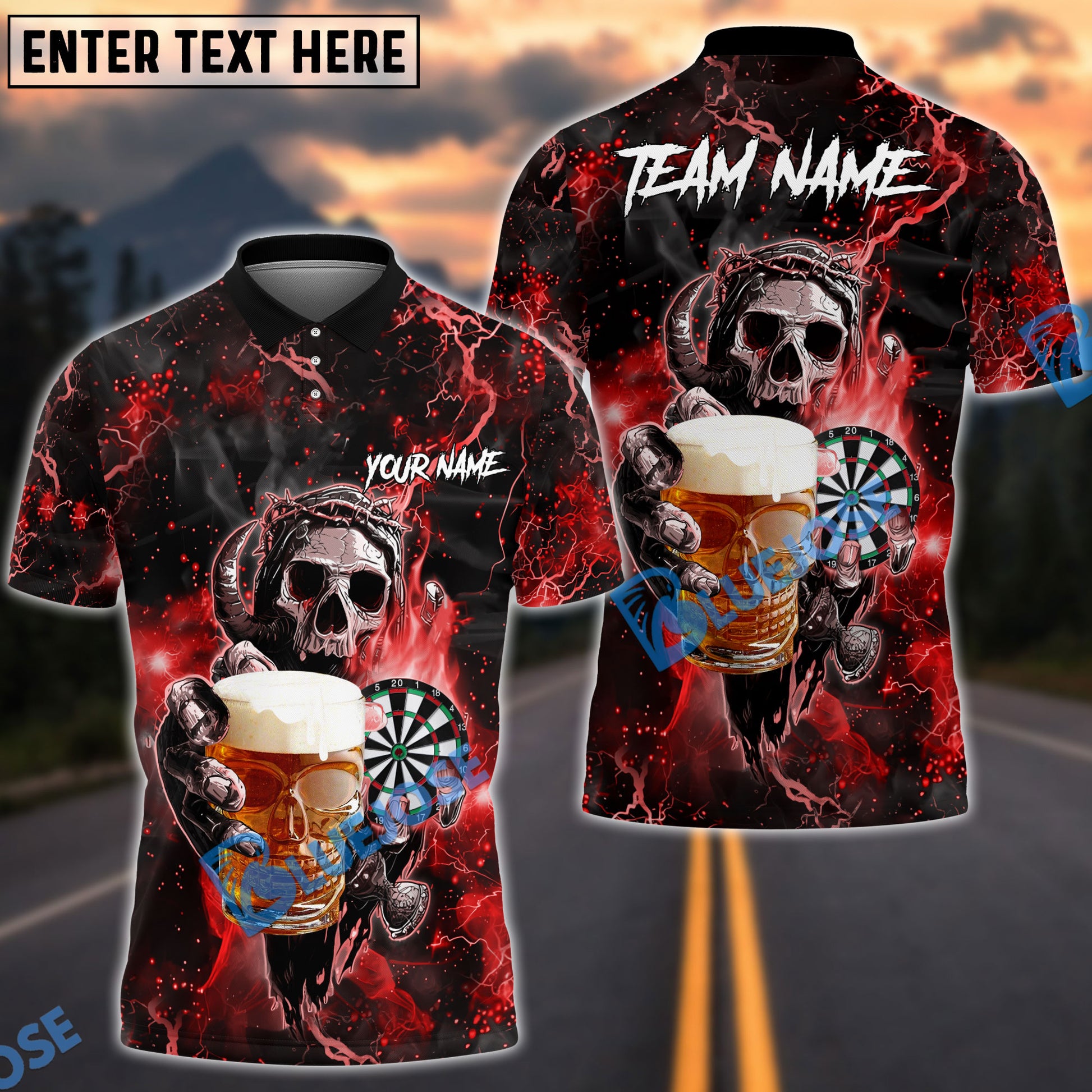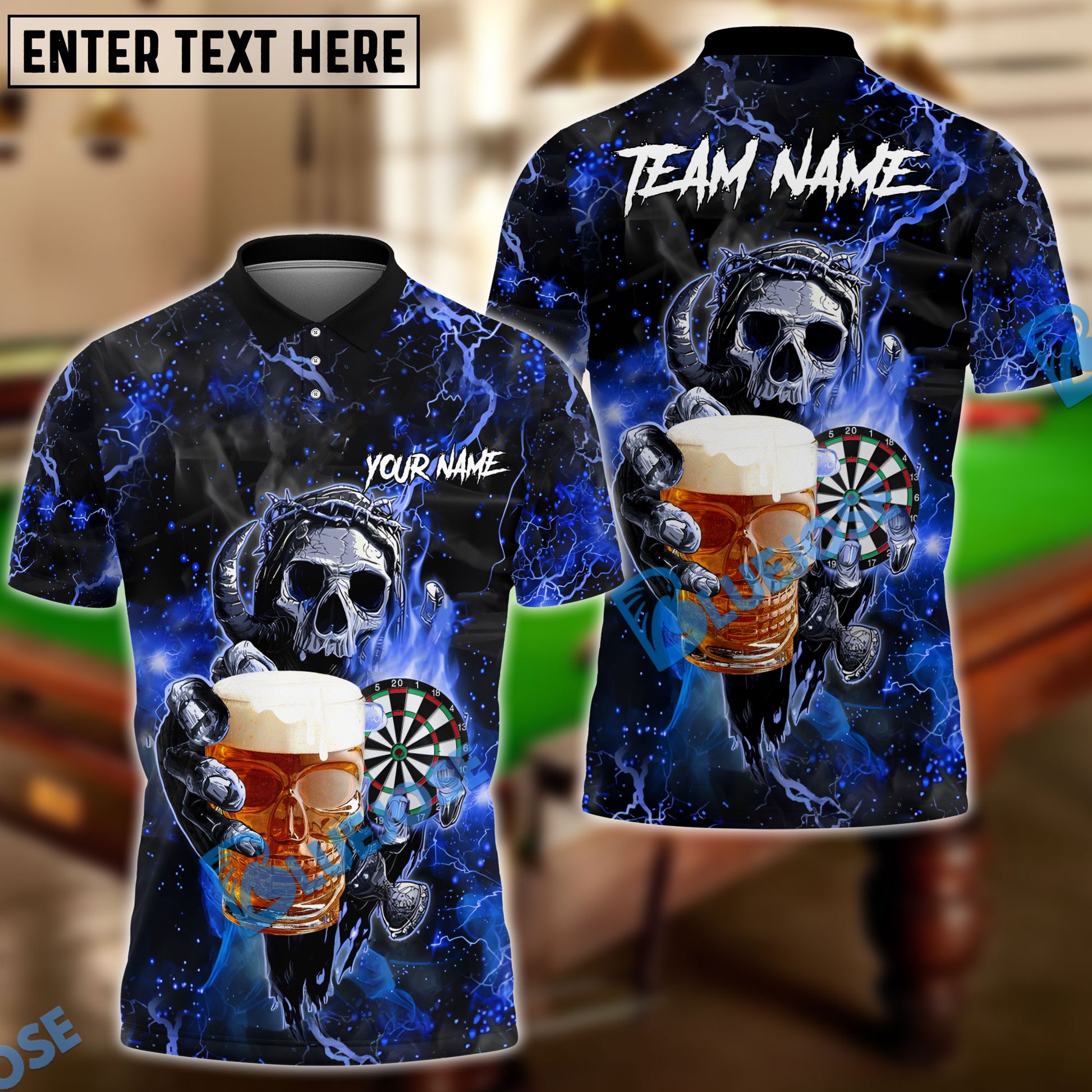 BlueJose Darts Fire Skull Beer Personalized Name, Team Name Shirt (6 Colors)
