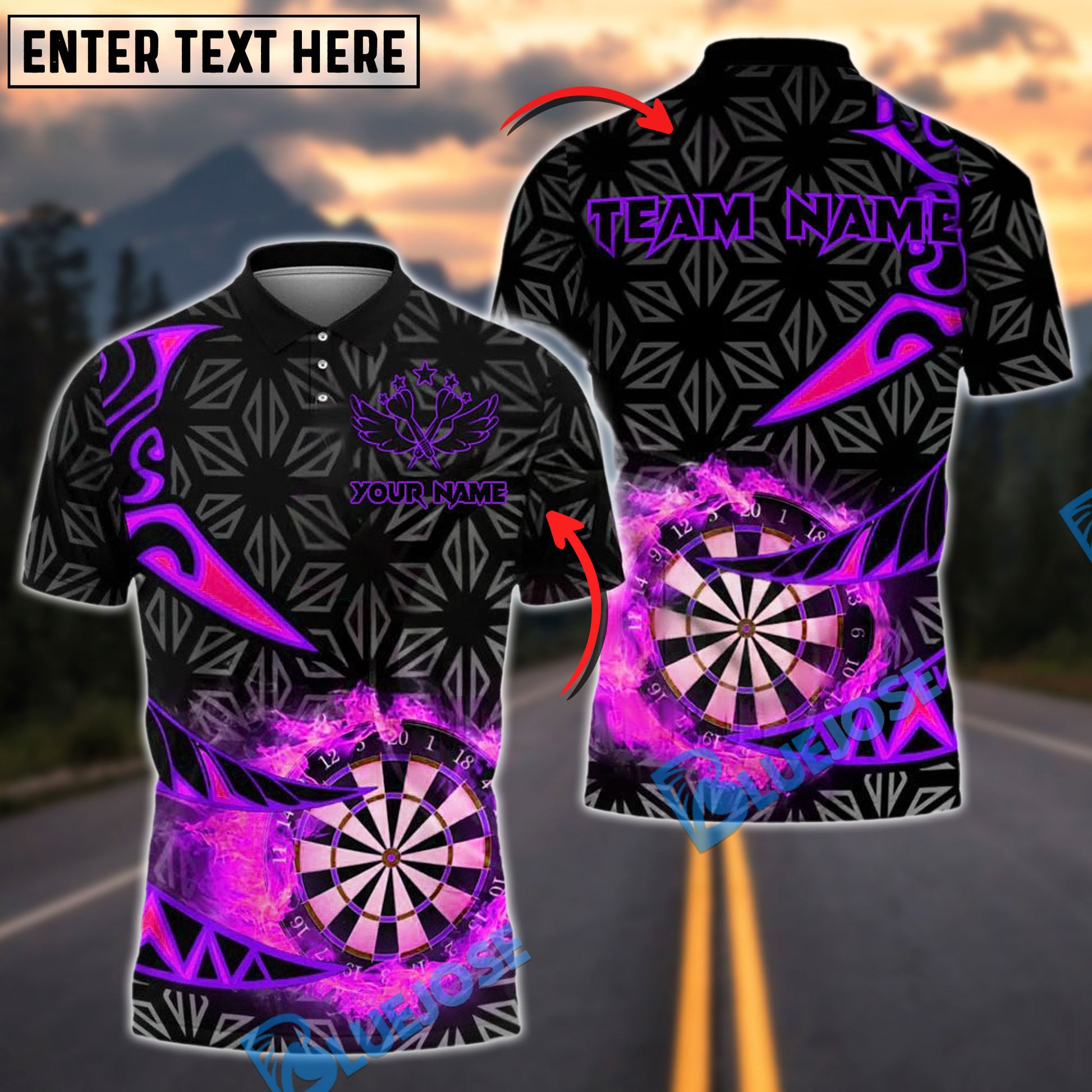 BlueJose Darts Flaming Dartboard Tribal Arrows Personalized Name, Team Name Shirt (4 Colors)