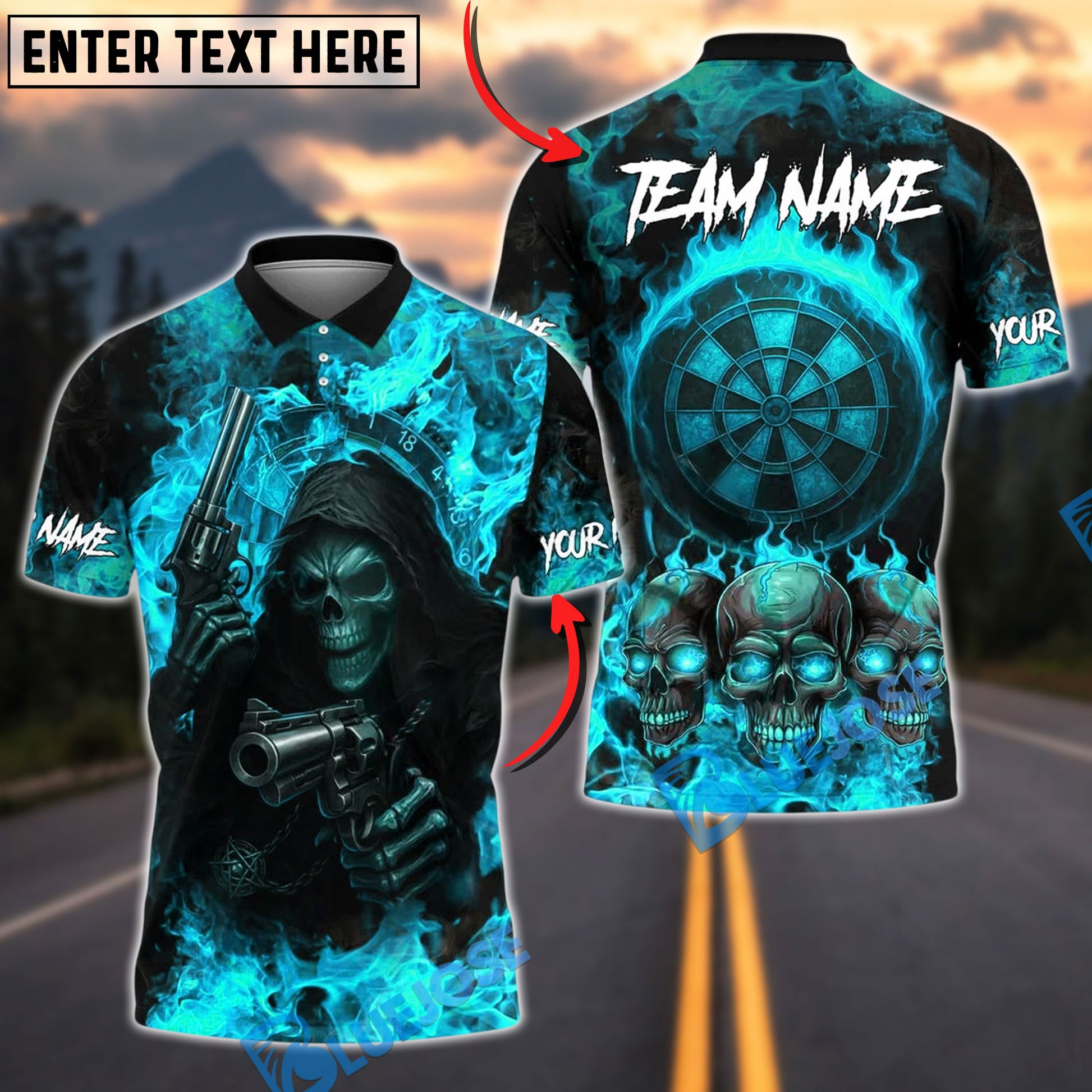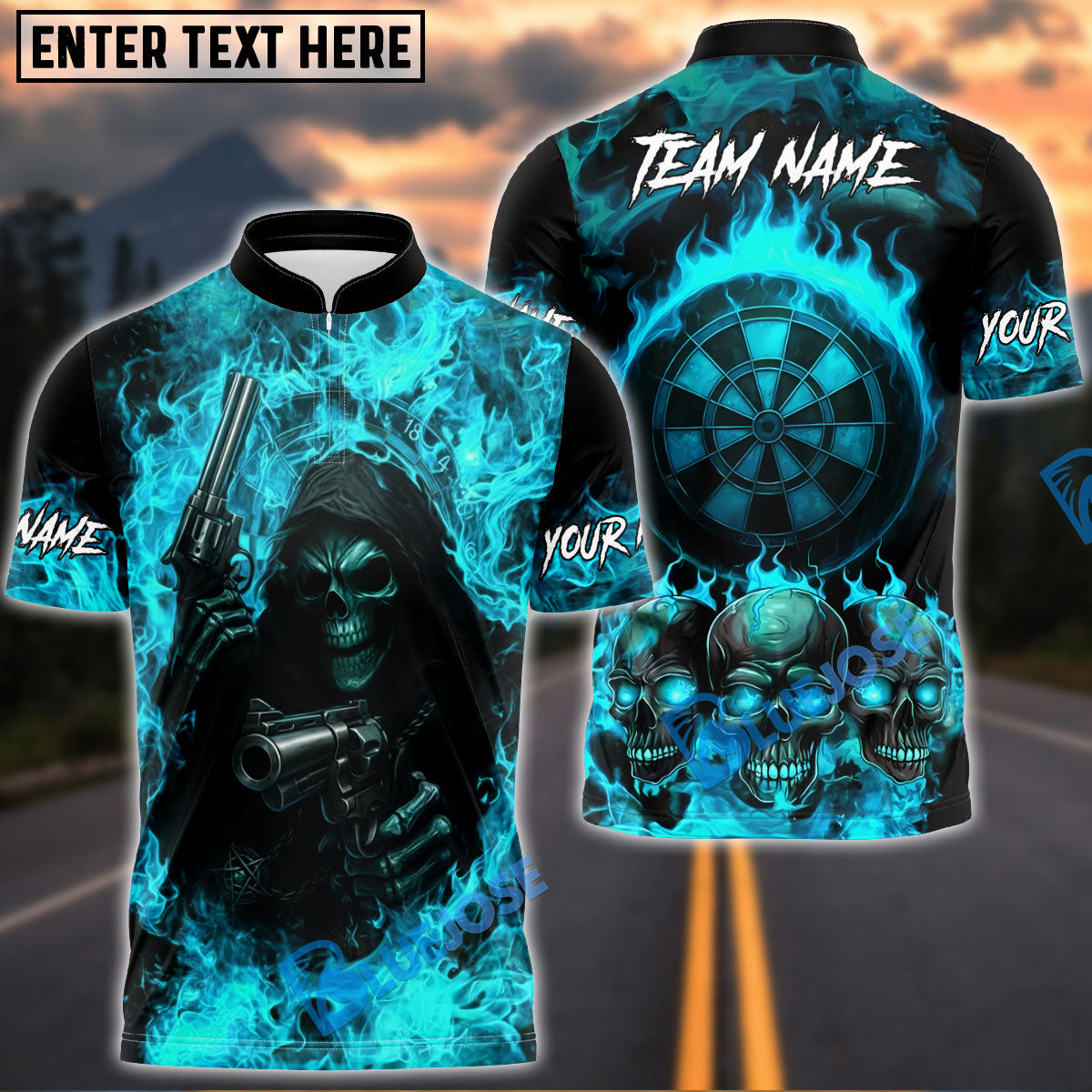 BlueJose Darts Flaming Skull Reaper And Gun Personalized Name, Team Name Unisex Shirt (4 Colors)