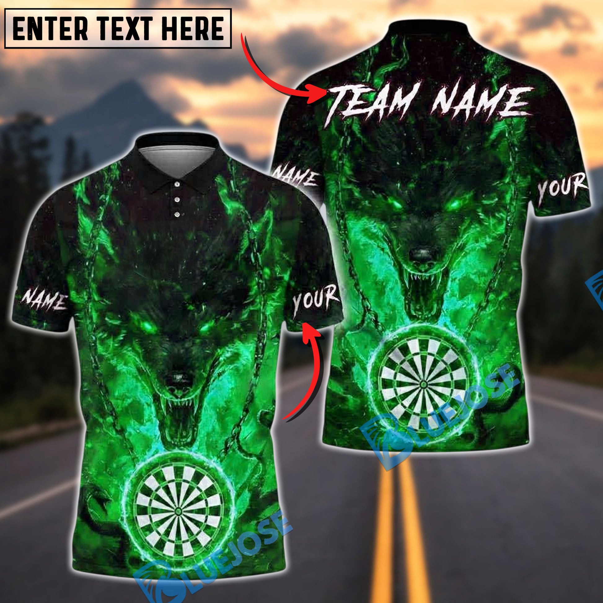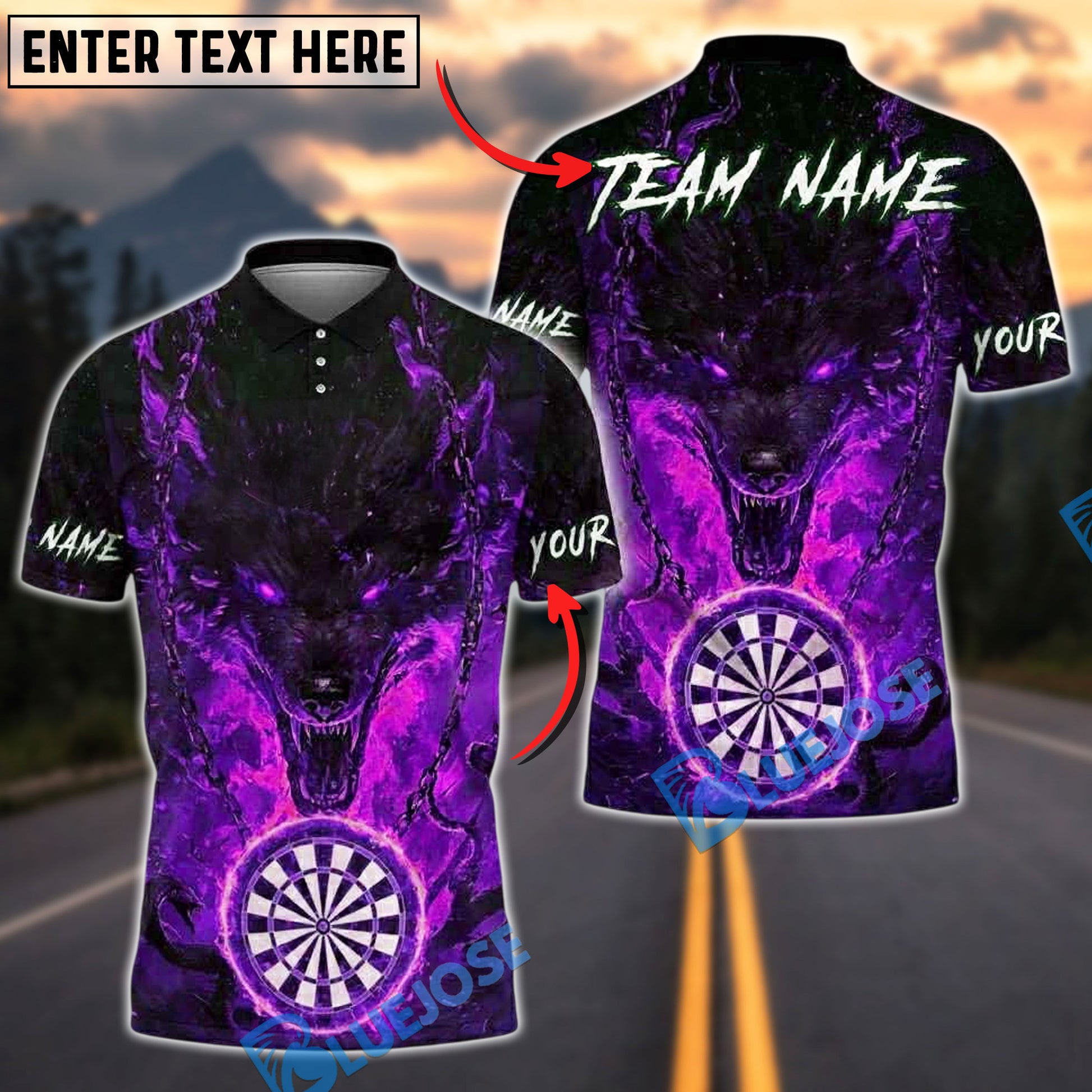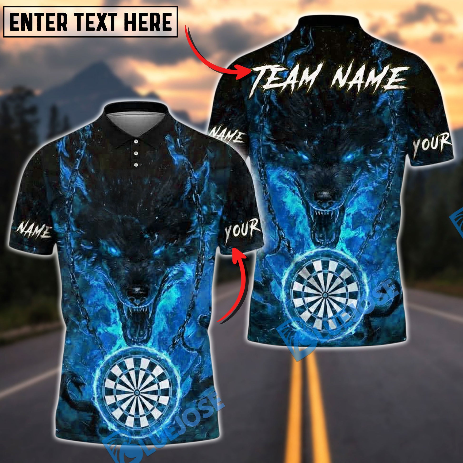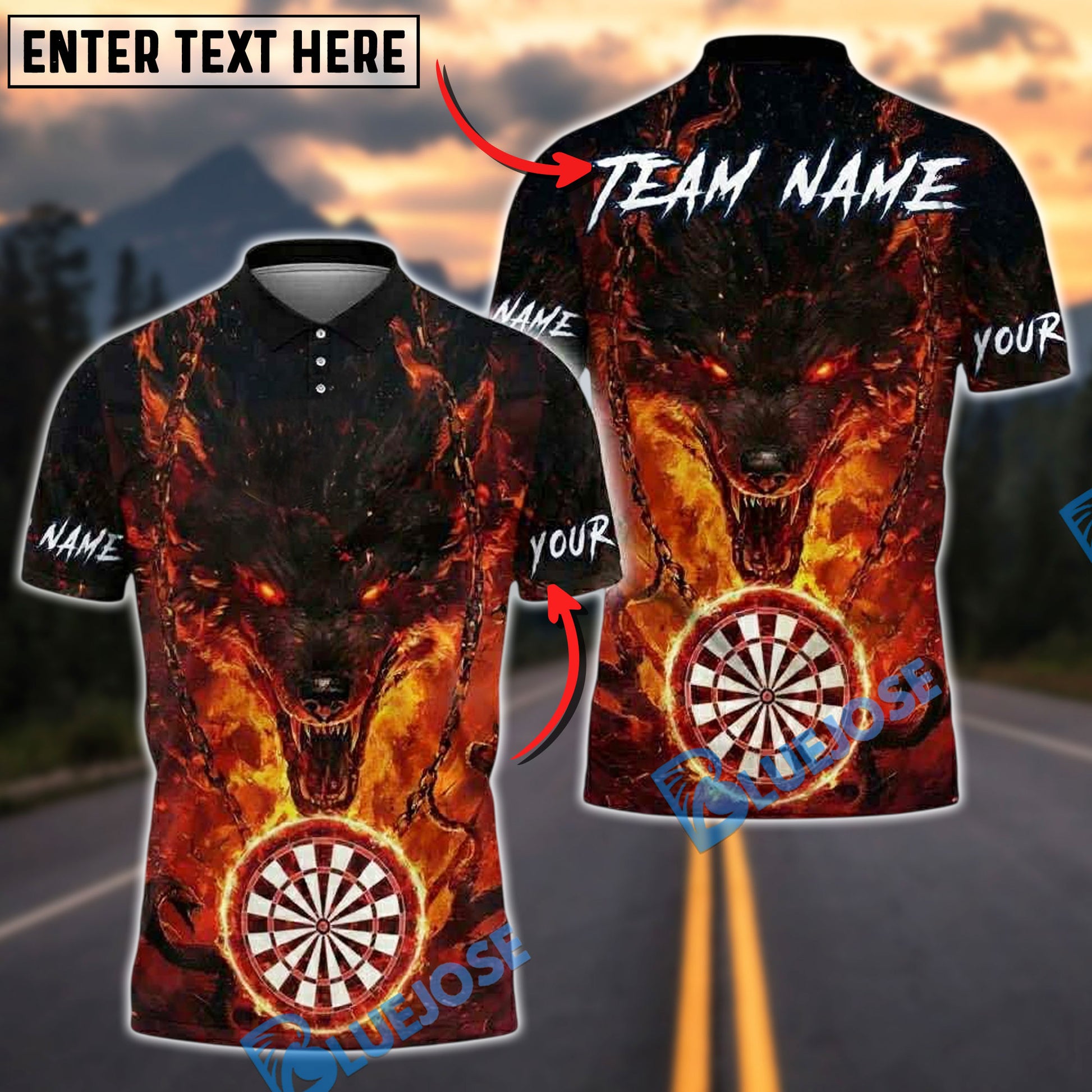 BlueJose Darts Flaming Wolf Fire Chains Dartboard Personalized Name, Team Name Unisex Shirt (4 Colors)