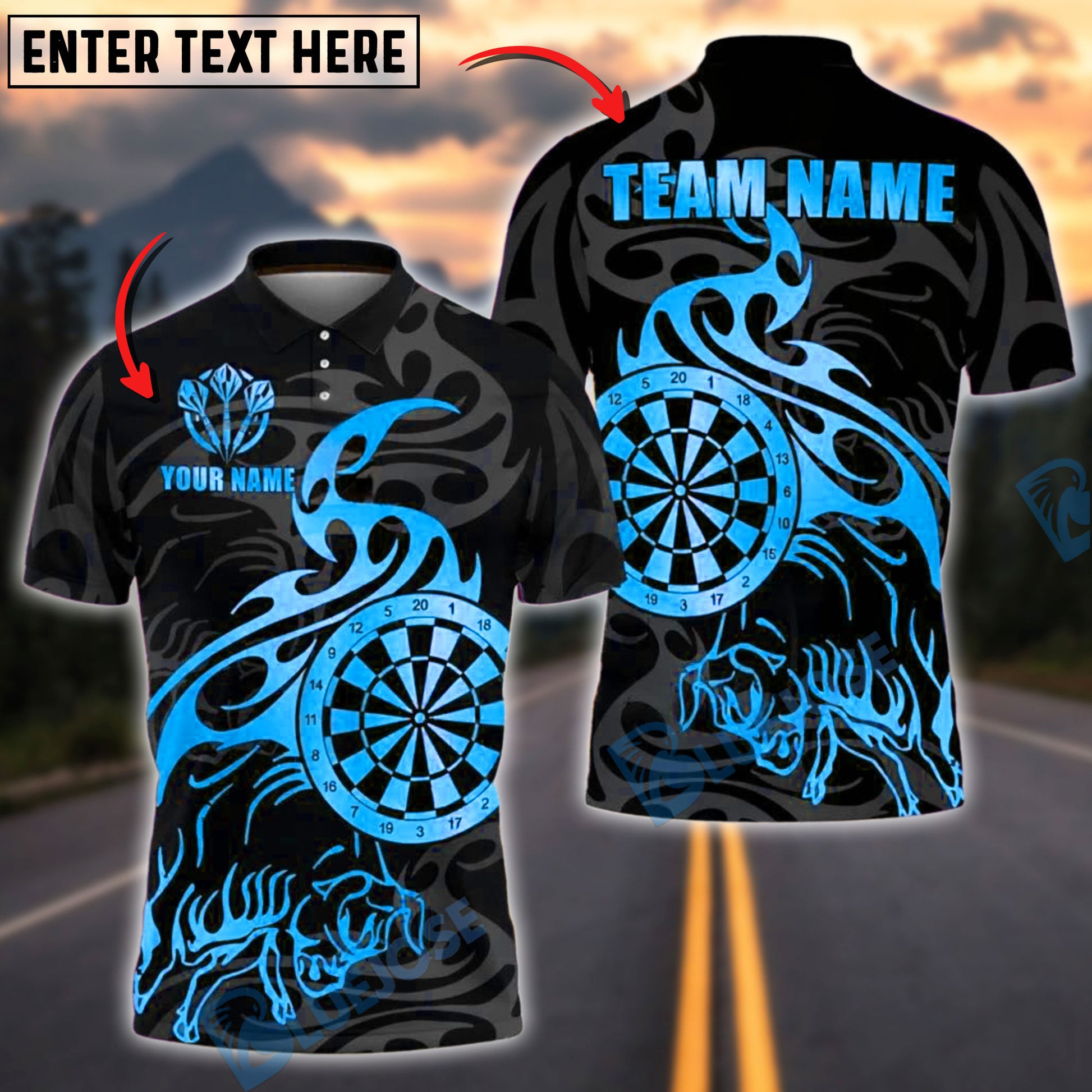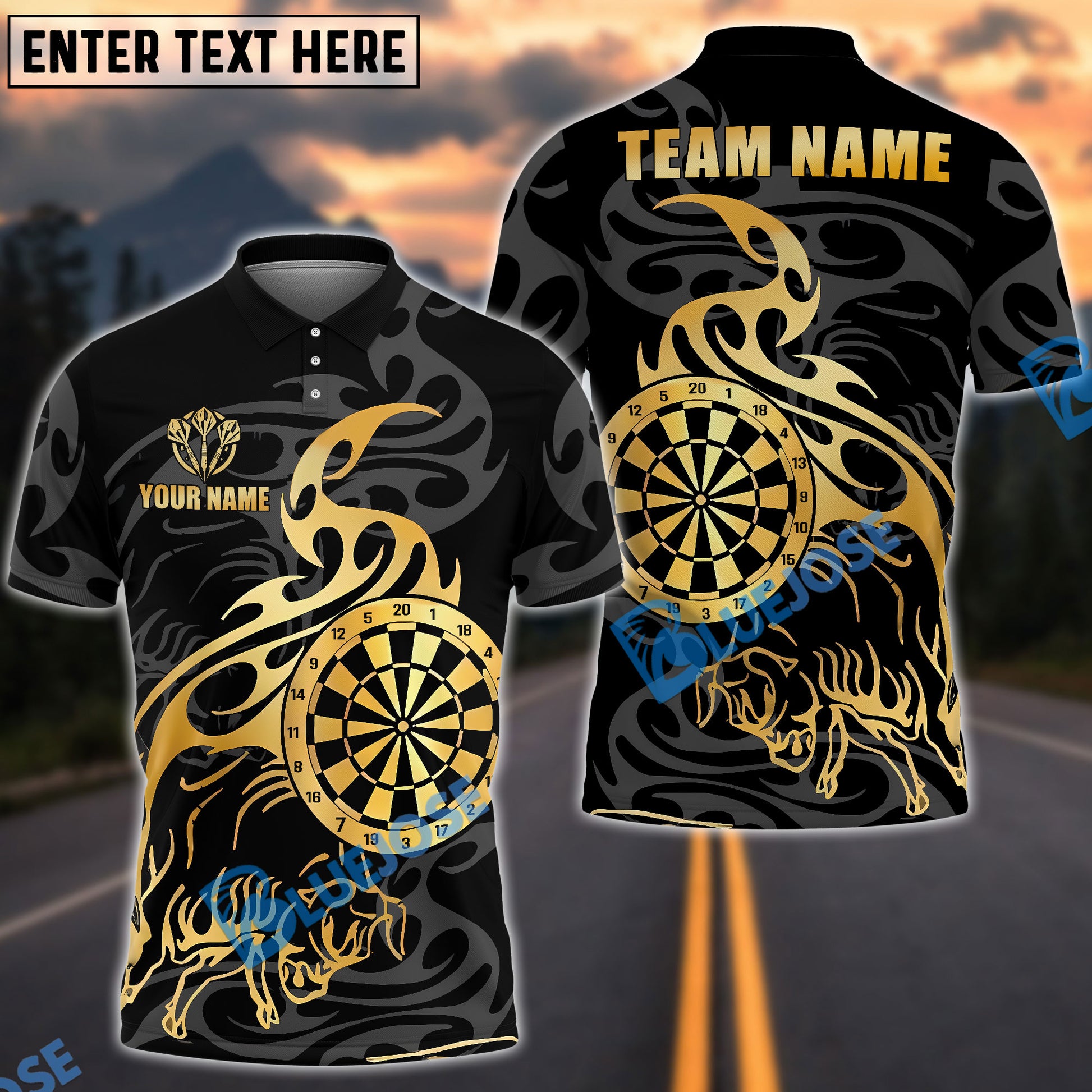 BlueJose Darts Golden Bull Tribal Flame Customized Name, Team Name 3D Shirt (4 Colors)