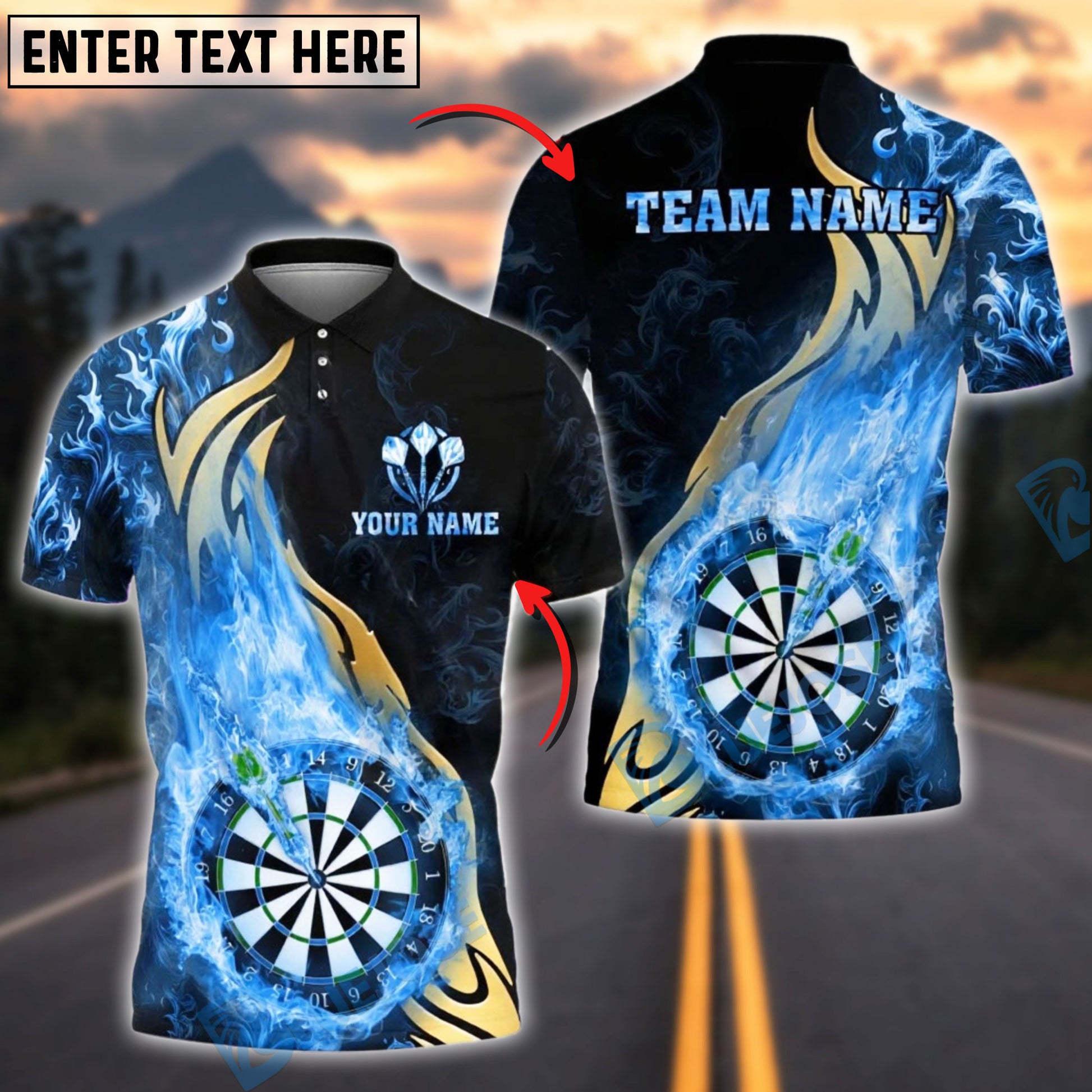 BlueJose Darts Golden Rainbow Flame Dartboard Customized Name, Team Name 3D Shirt (4 Colors)