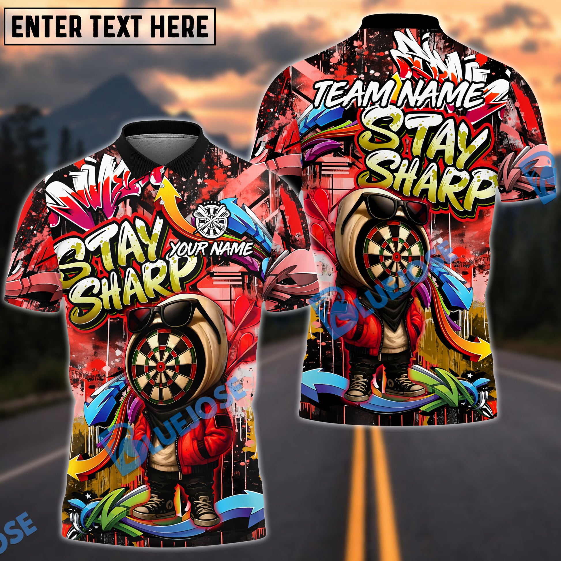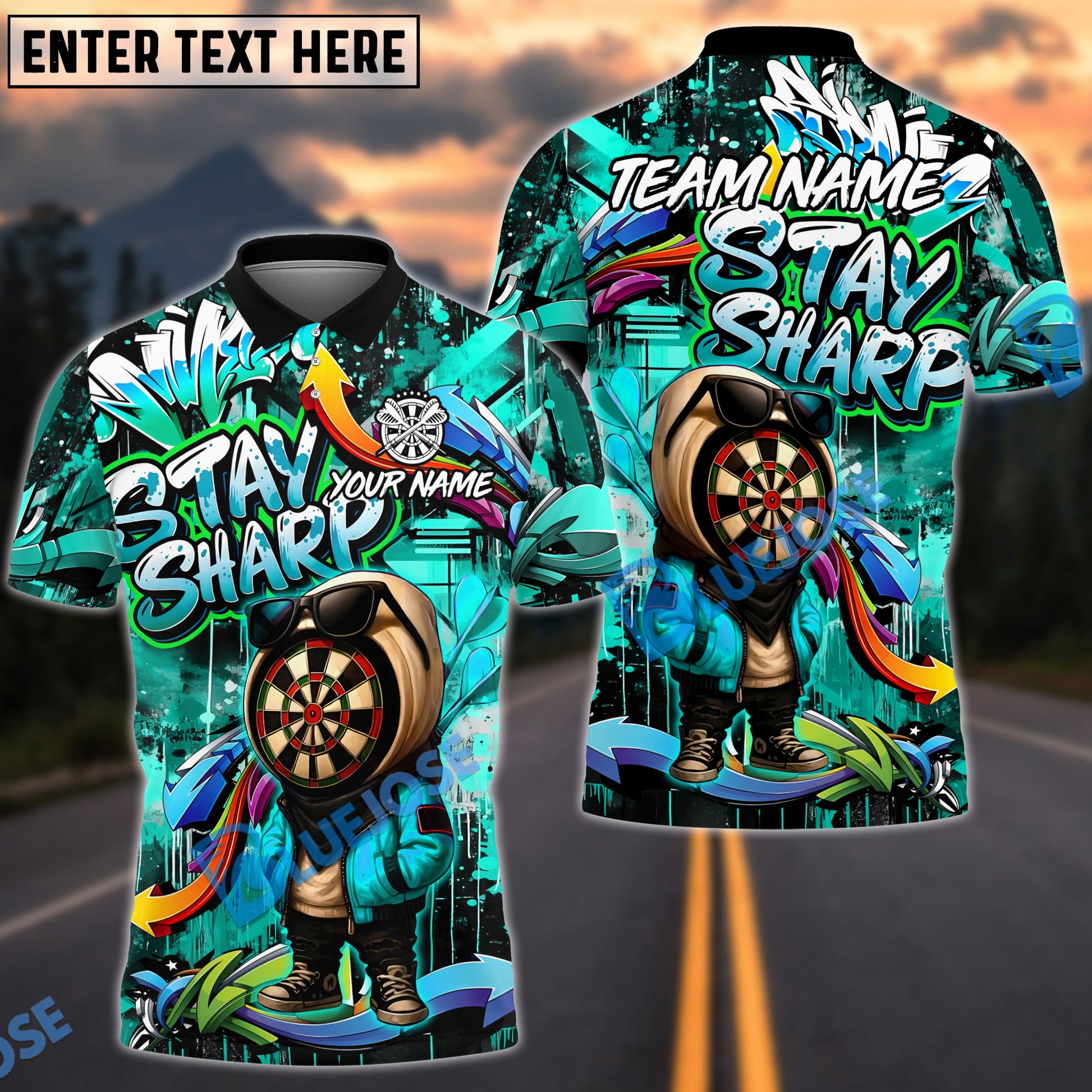 BlueJose Darts Graffiti Character Stay Sharp Personalized Name, Team Name Unisex Shirt (4 Colors)
