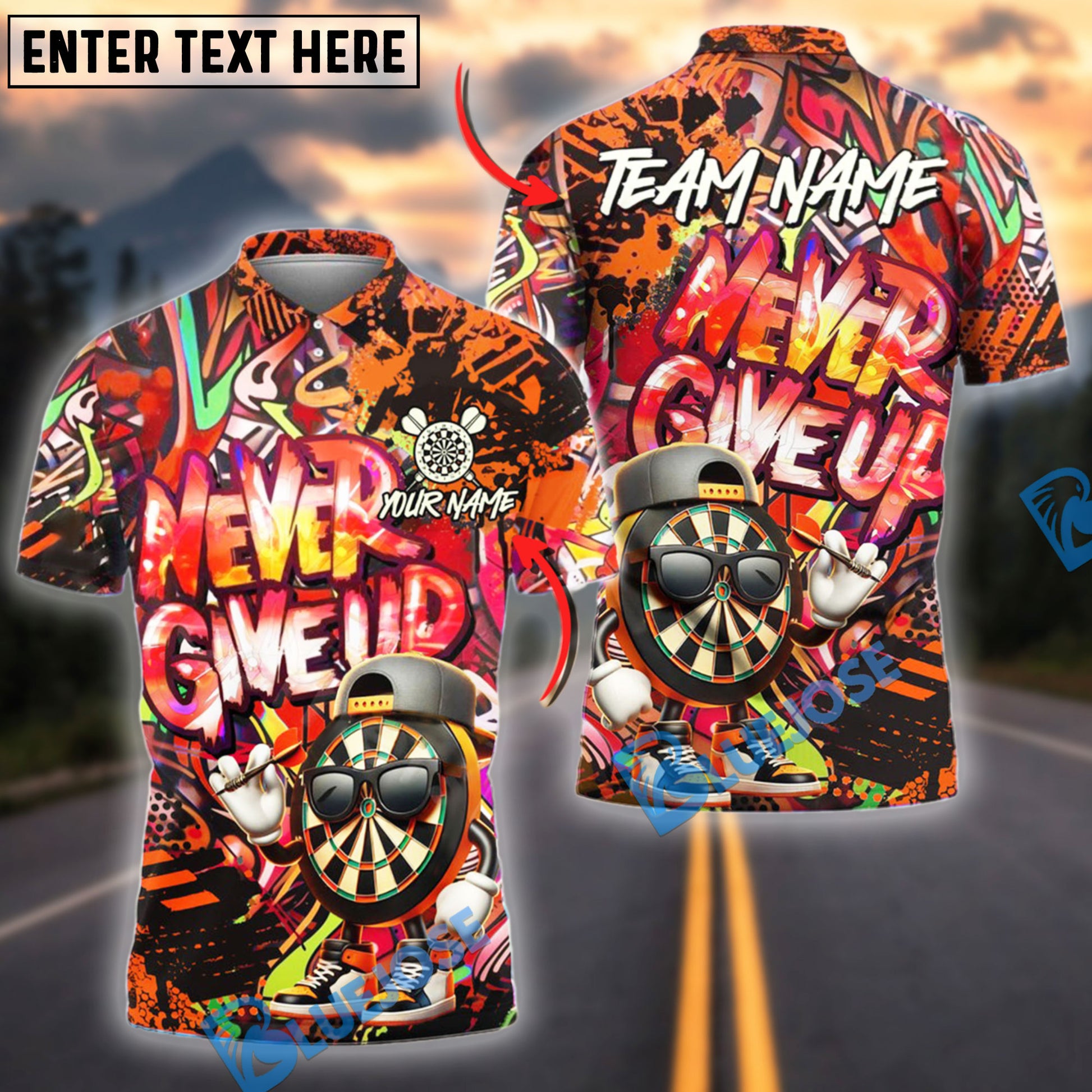 BlueJose Darts Graffiti Funny Never Give Up Dartboard Personalized Name, Team Name Shirt (4 Colors)