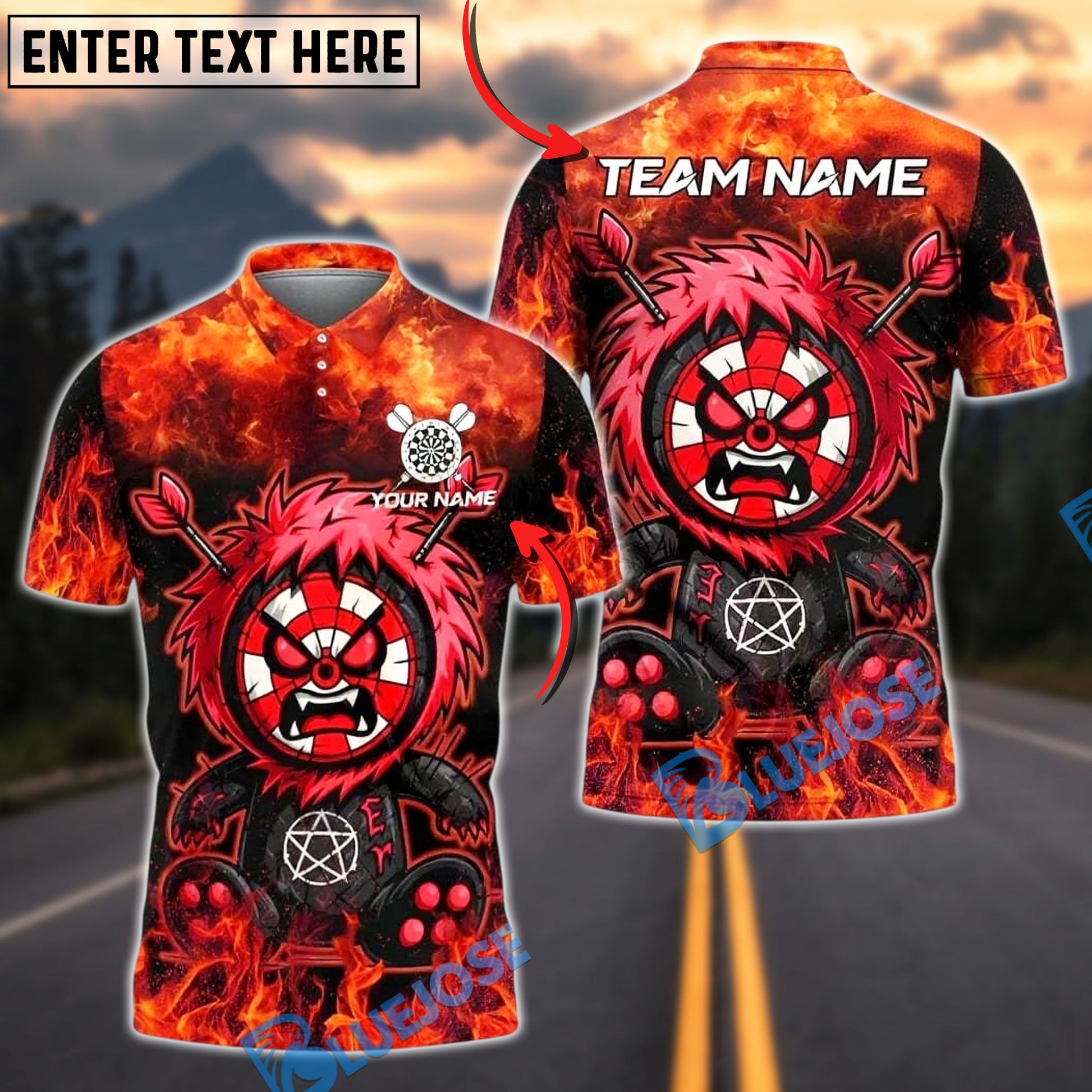 BlueJose Darts Monster Paint Flame Personalized Name, Team Name Unisex Shirt (4 Colors)
