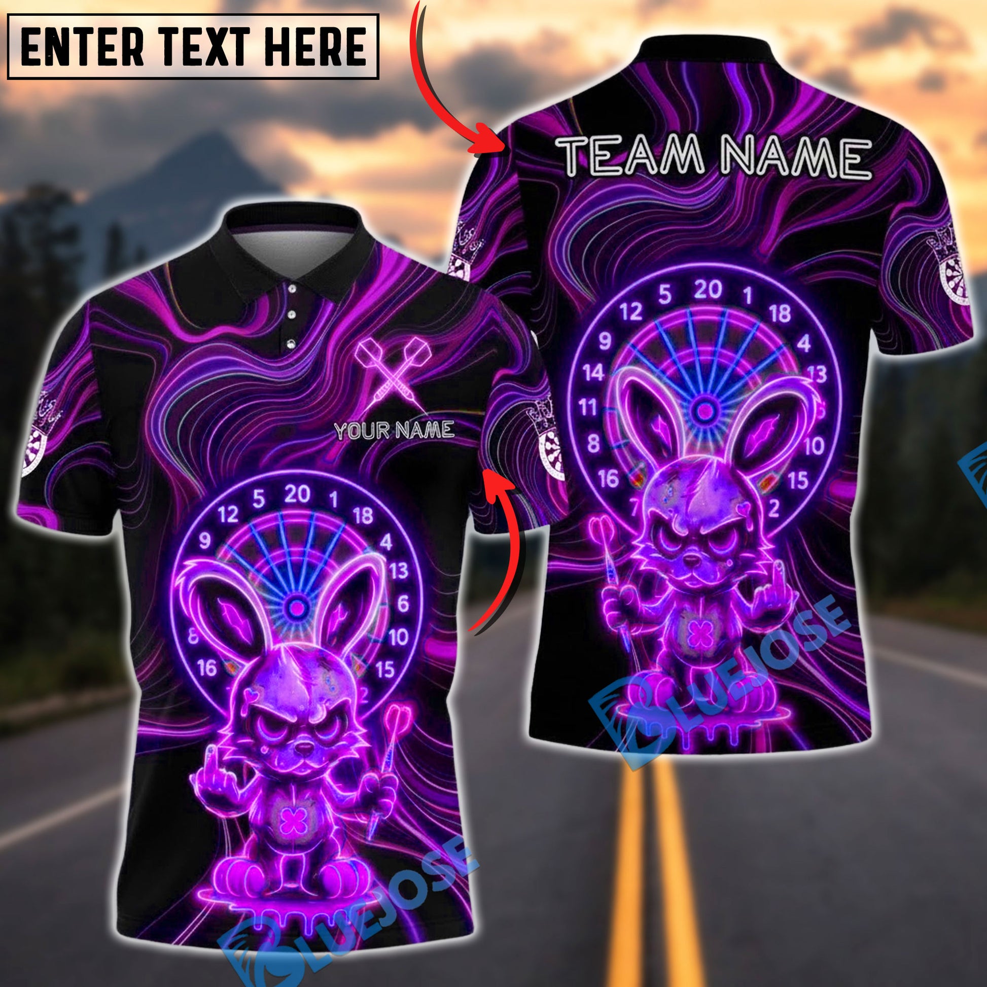 BlueJose Darts Neon Angry Bunny Dartboard Intense Glow Multicolor Options Personalized Name Shirt (4 Colors)