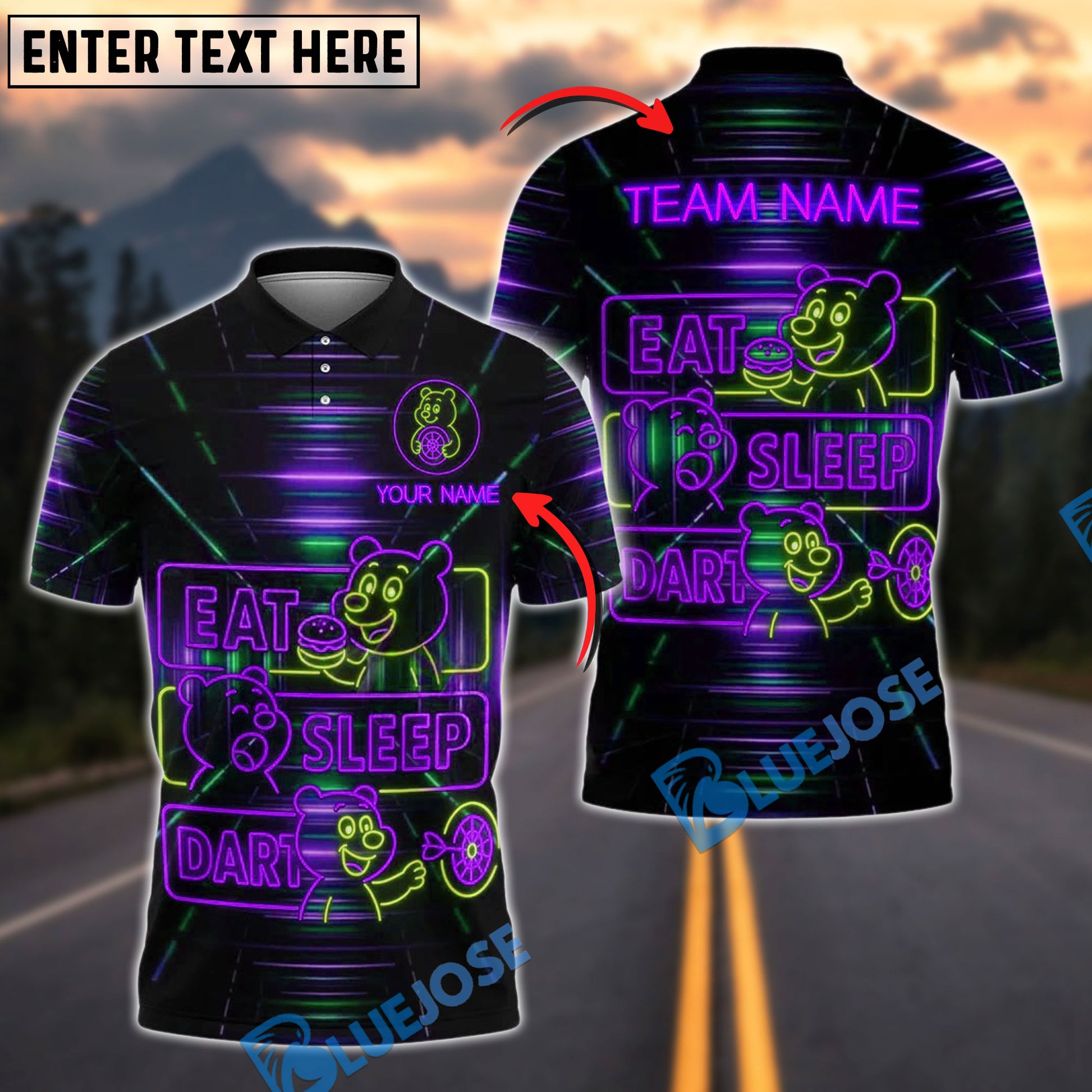 BlueJose Darts Neon Bear Eat Sleep Dart Personalized Name, Team Name Shirt (4 Colors)