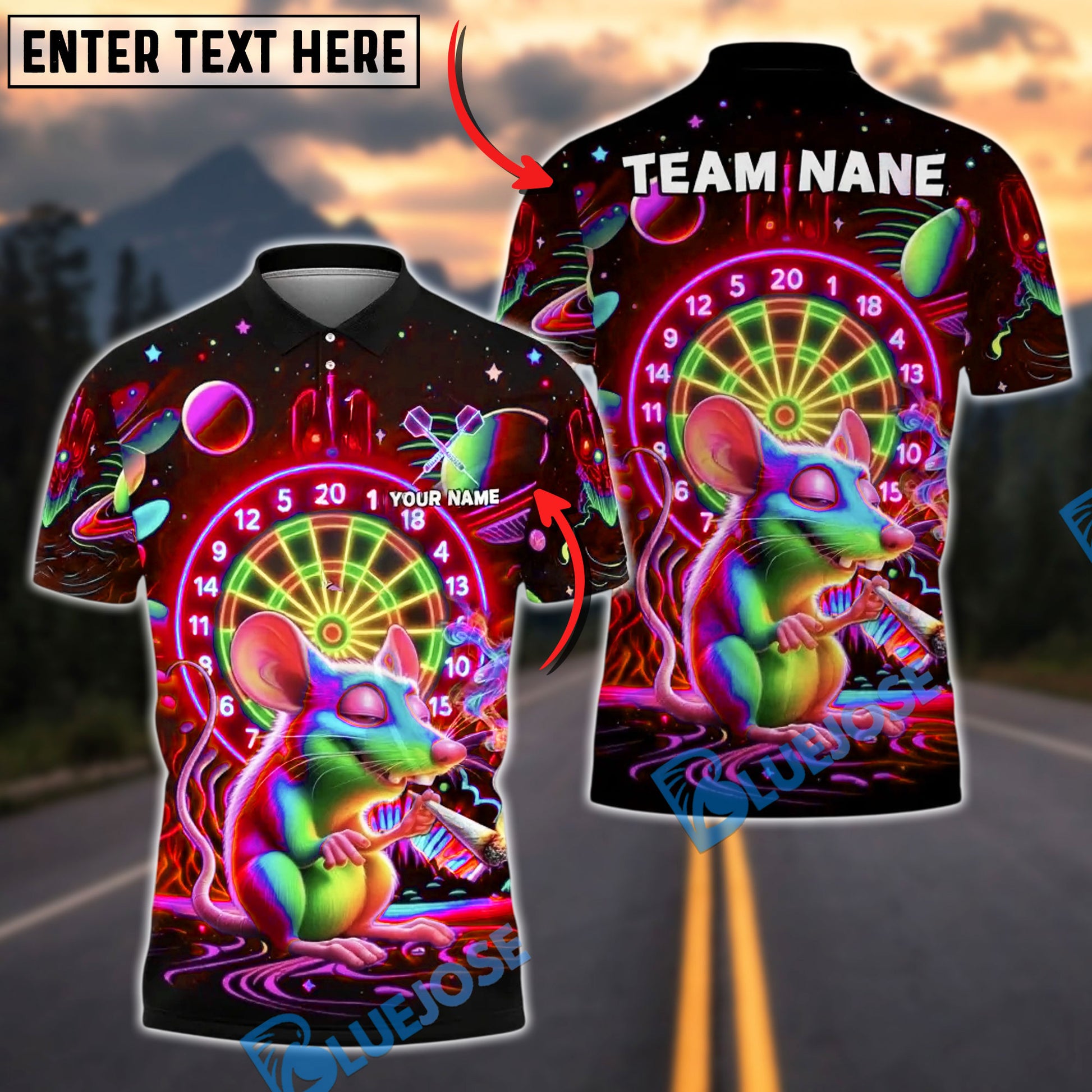 BlueJose Darts Neon Galaxy Mouse Smoke Dartboard Personalized Name, Team Name Unisex Shirt (4 Colors)