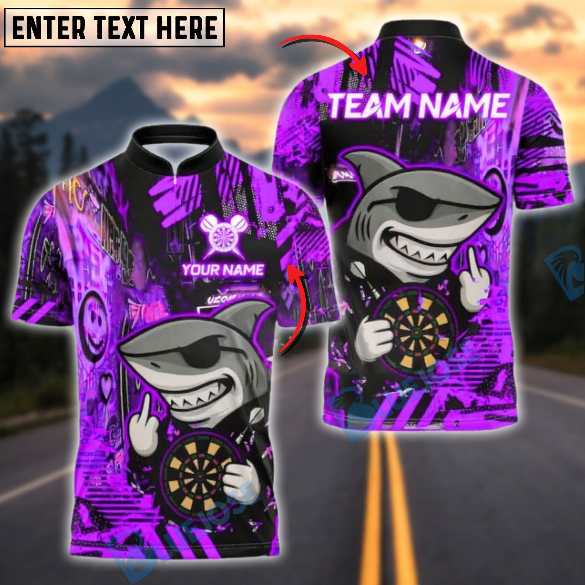 BlueJose Darts Shark Graffiti Neon Style Customized Name, Team Name 3D Shirt (4 Colors)