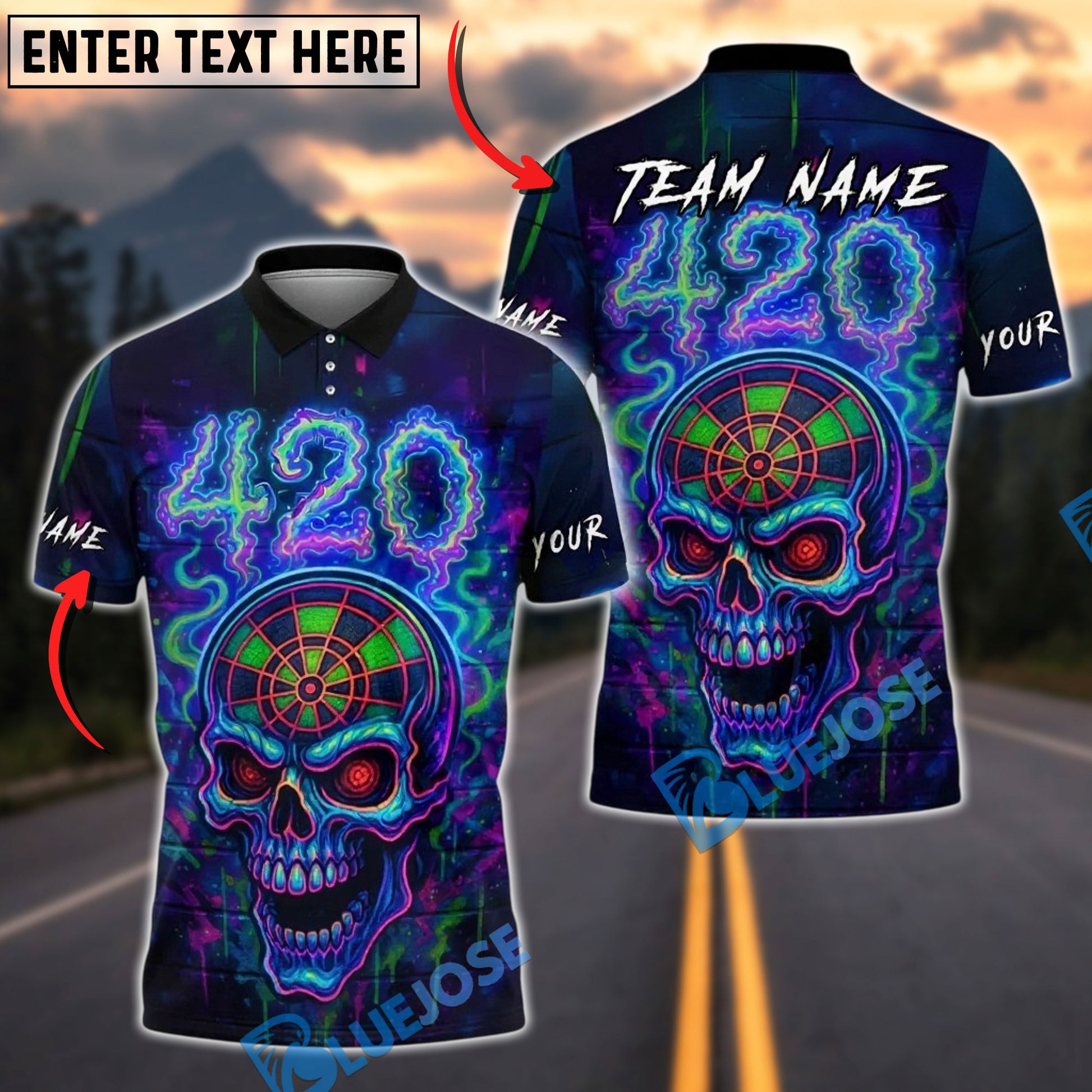 BlueJose Darts Skull 420 Neon Dartboard Glow Personalized Name, Team Name Unisex Shirt (4 Colors)