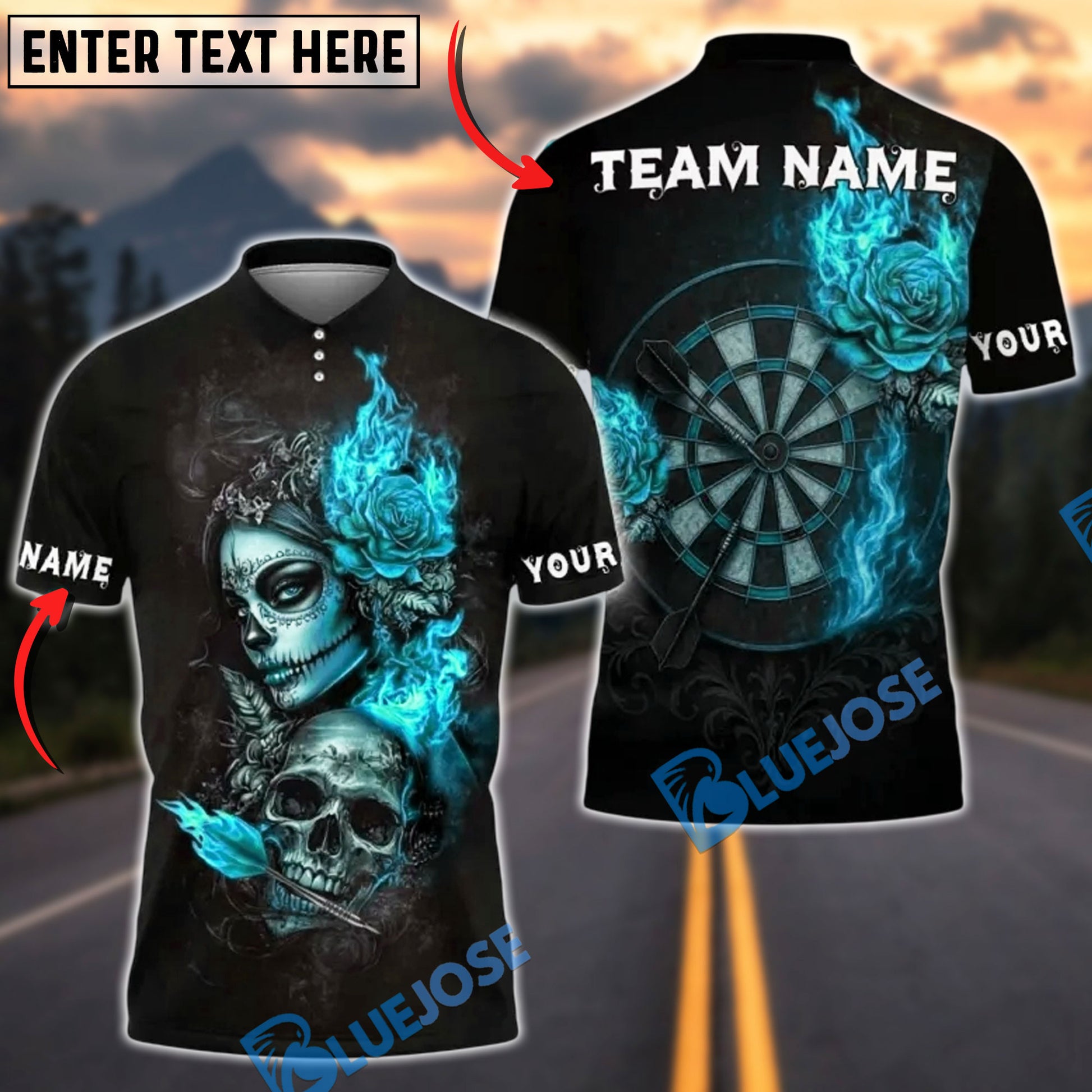 BlueJose Darts Skull and Rose Flame Design Personalized Name, Team Name Unisex Shirt (4 Colors)