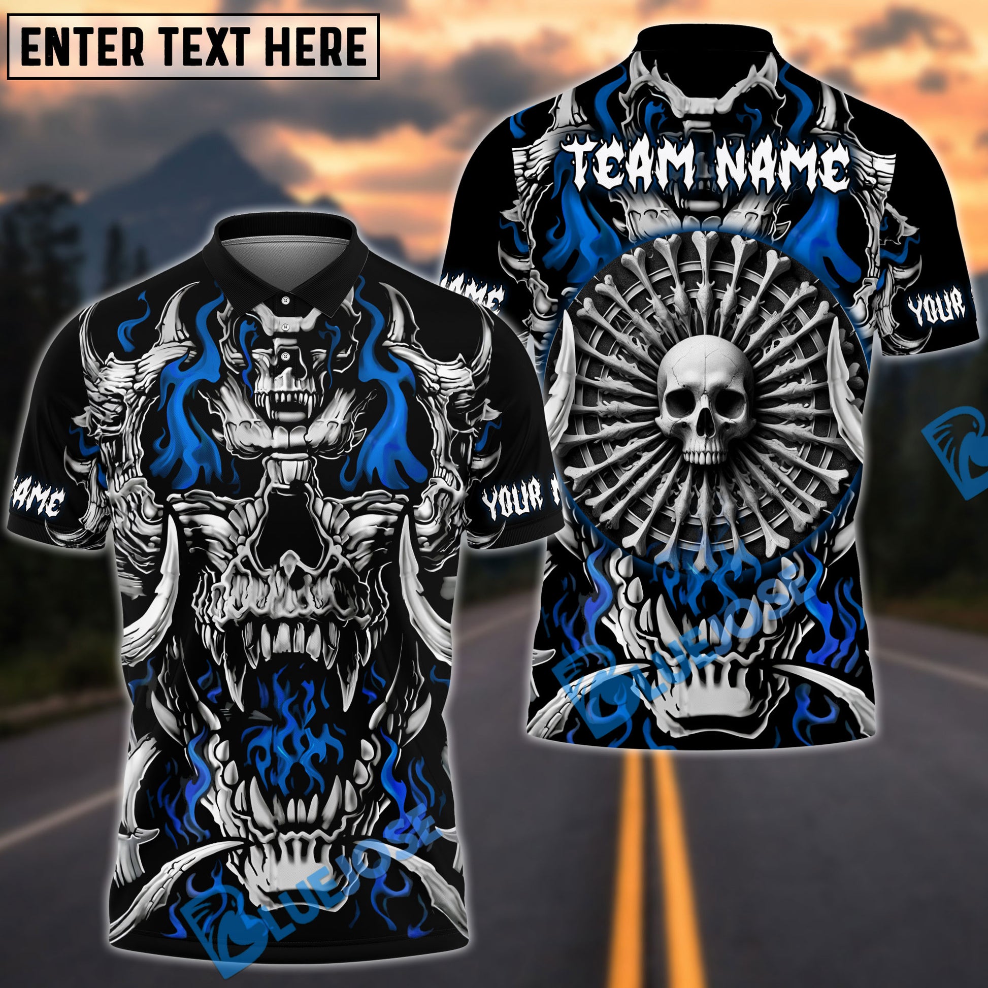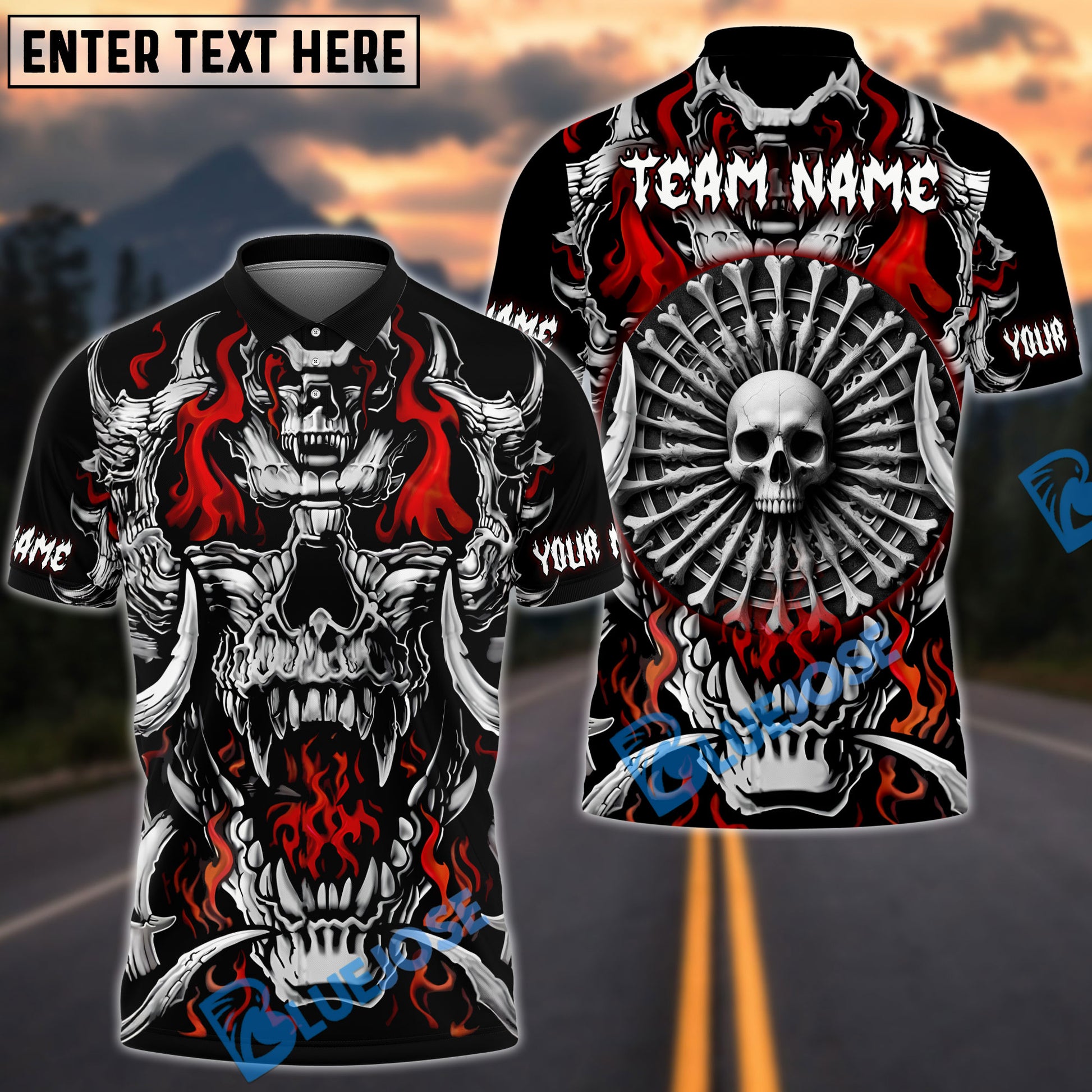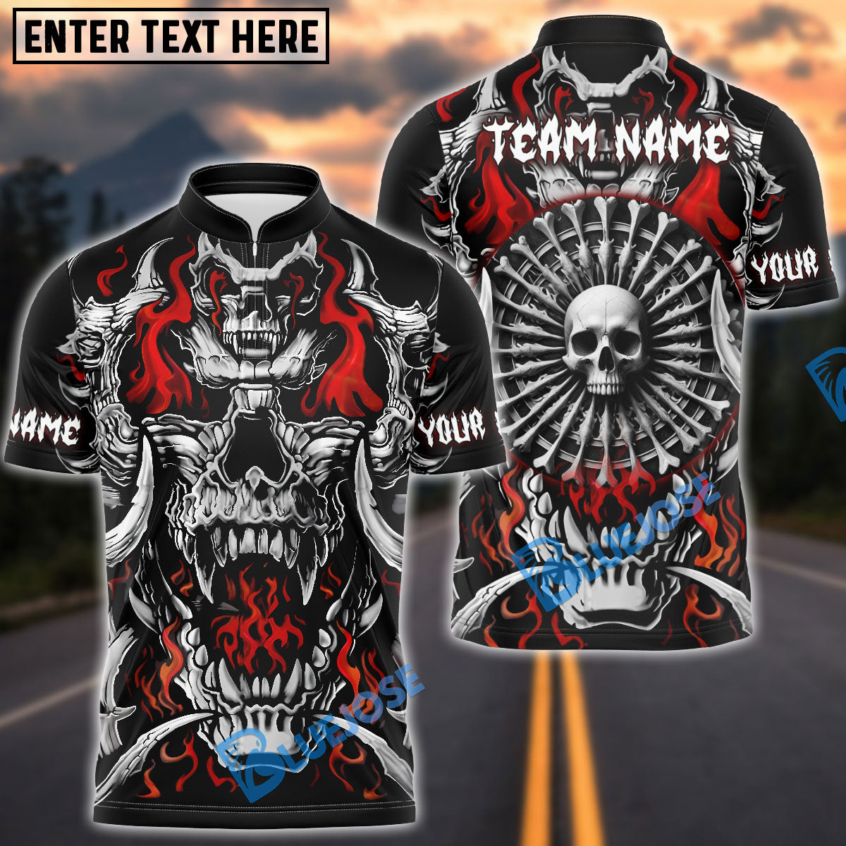 BlueJose Darts Skull Flame Bone Dartboard Personalized Name, Team Name Shirt (4 Colors)