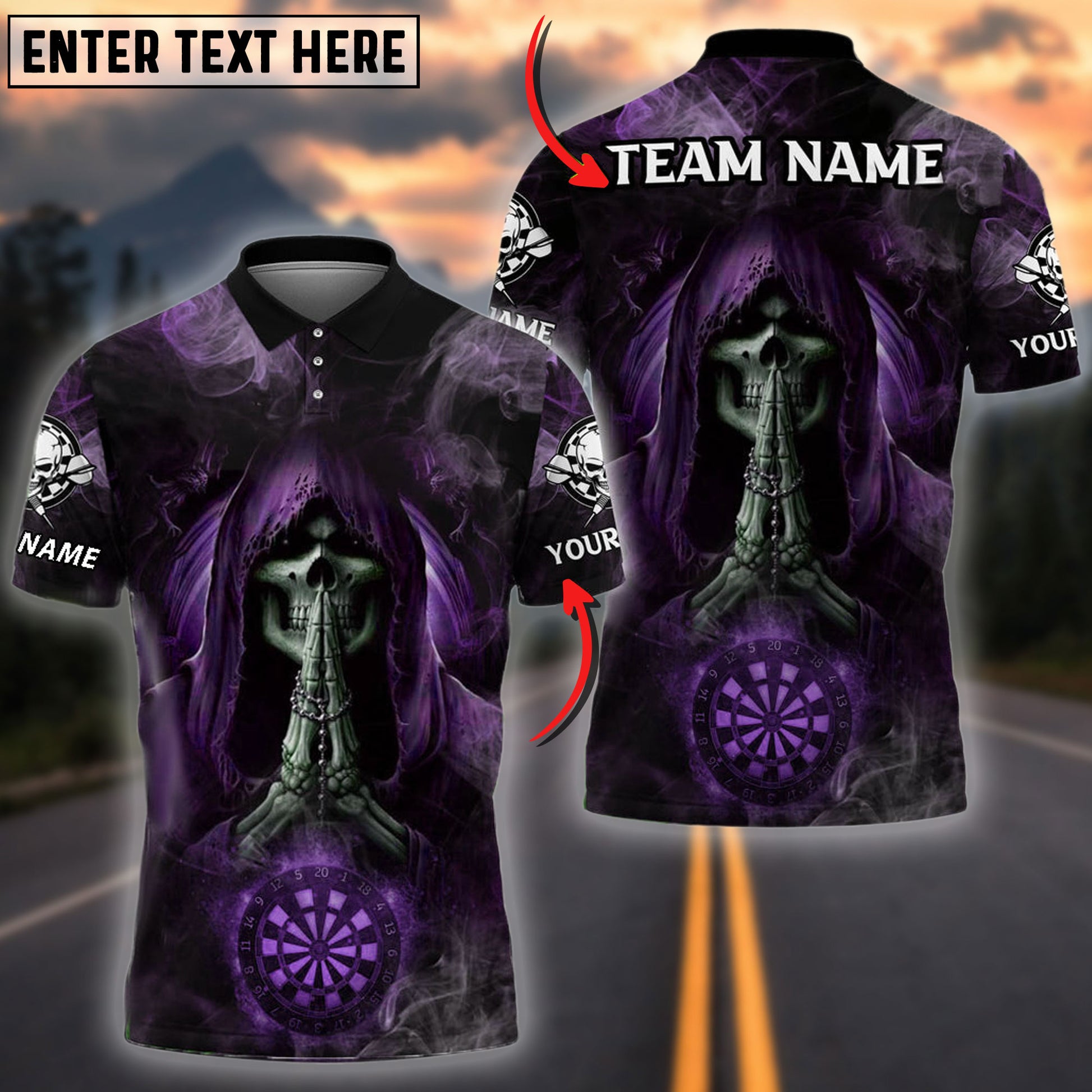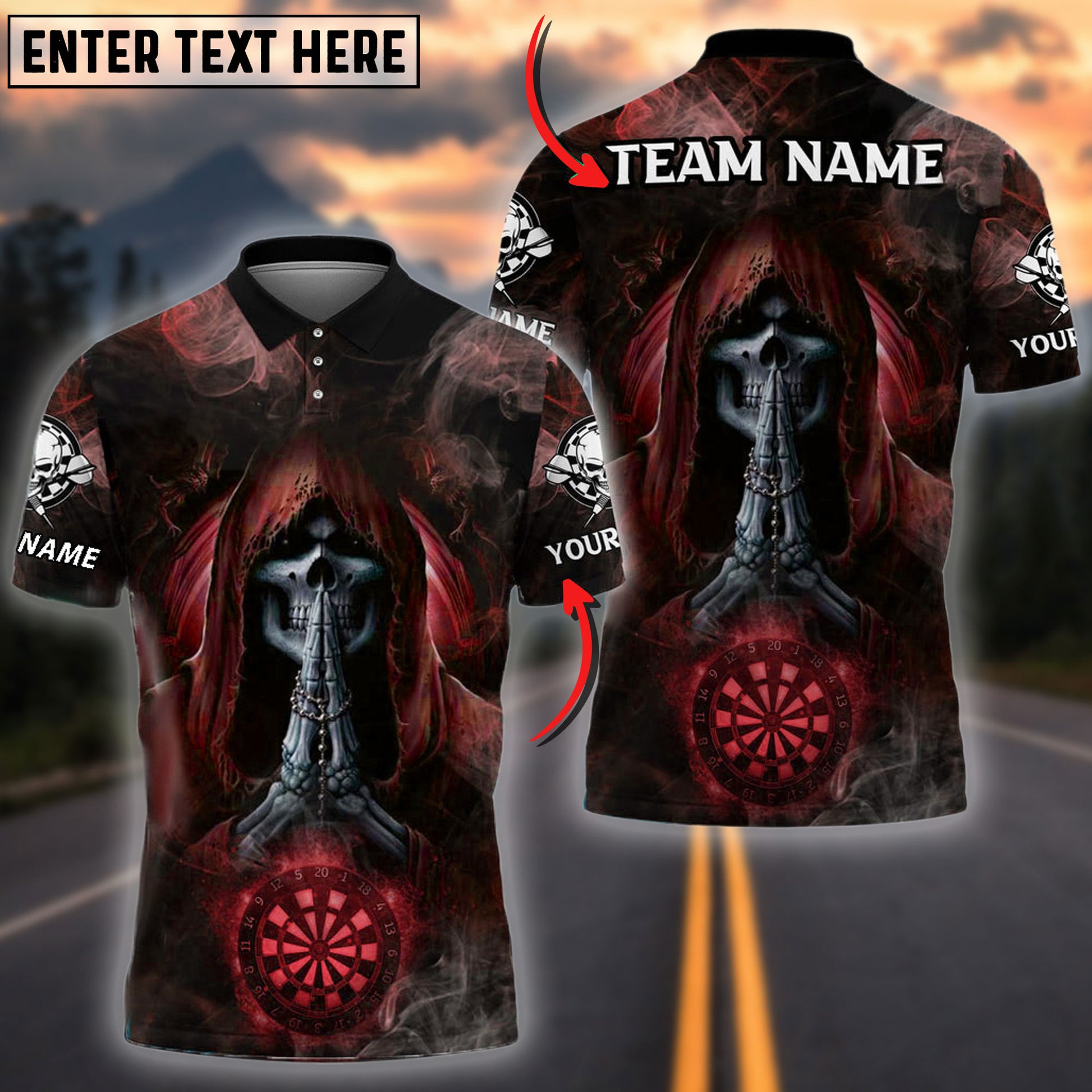BlueJose Darts Skull Smoke Praying Personalized Name, Team Name Shirt (4 Colors)