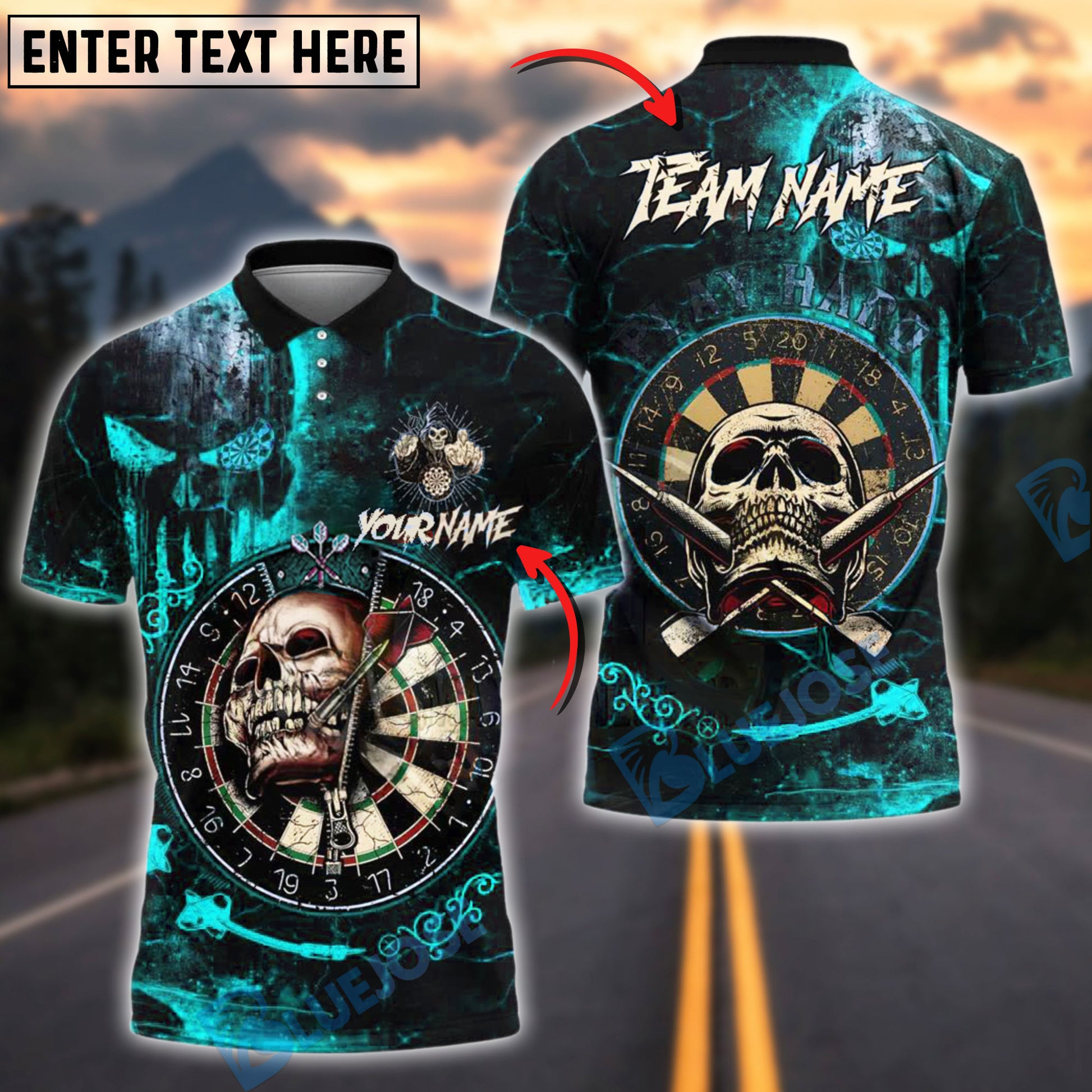 BlueJose Darts Skull Target Gothic Style Personalized Name, Team Name Shirt (4 Colors)