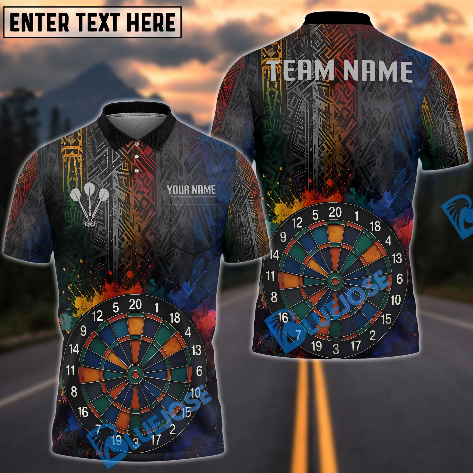BlueJose Darts Tribal Splash Colorful Precision Personalized Name, Team Name Shirt