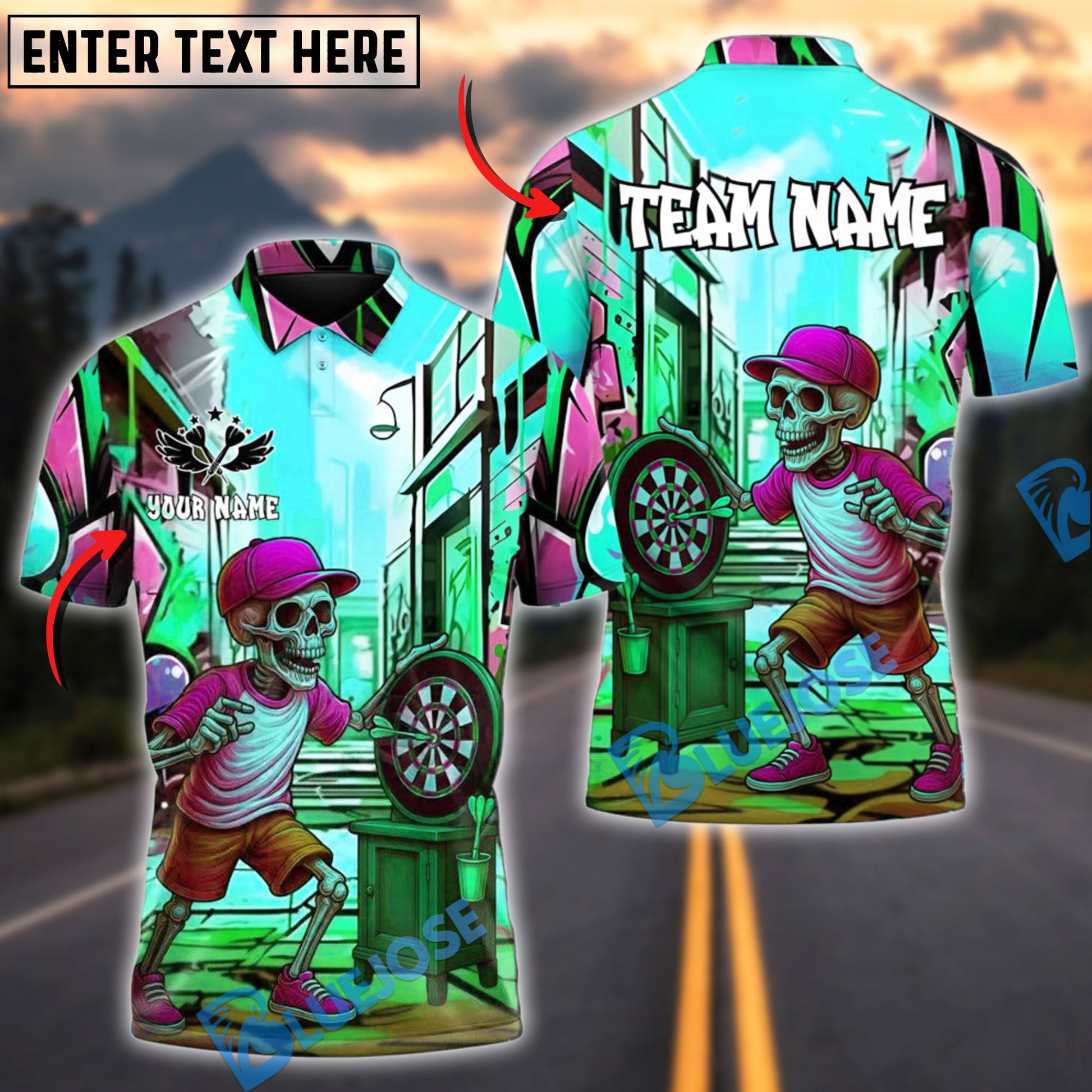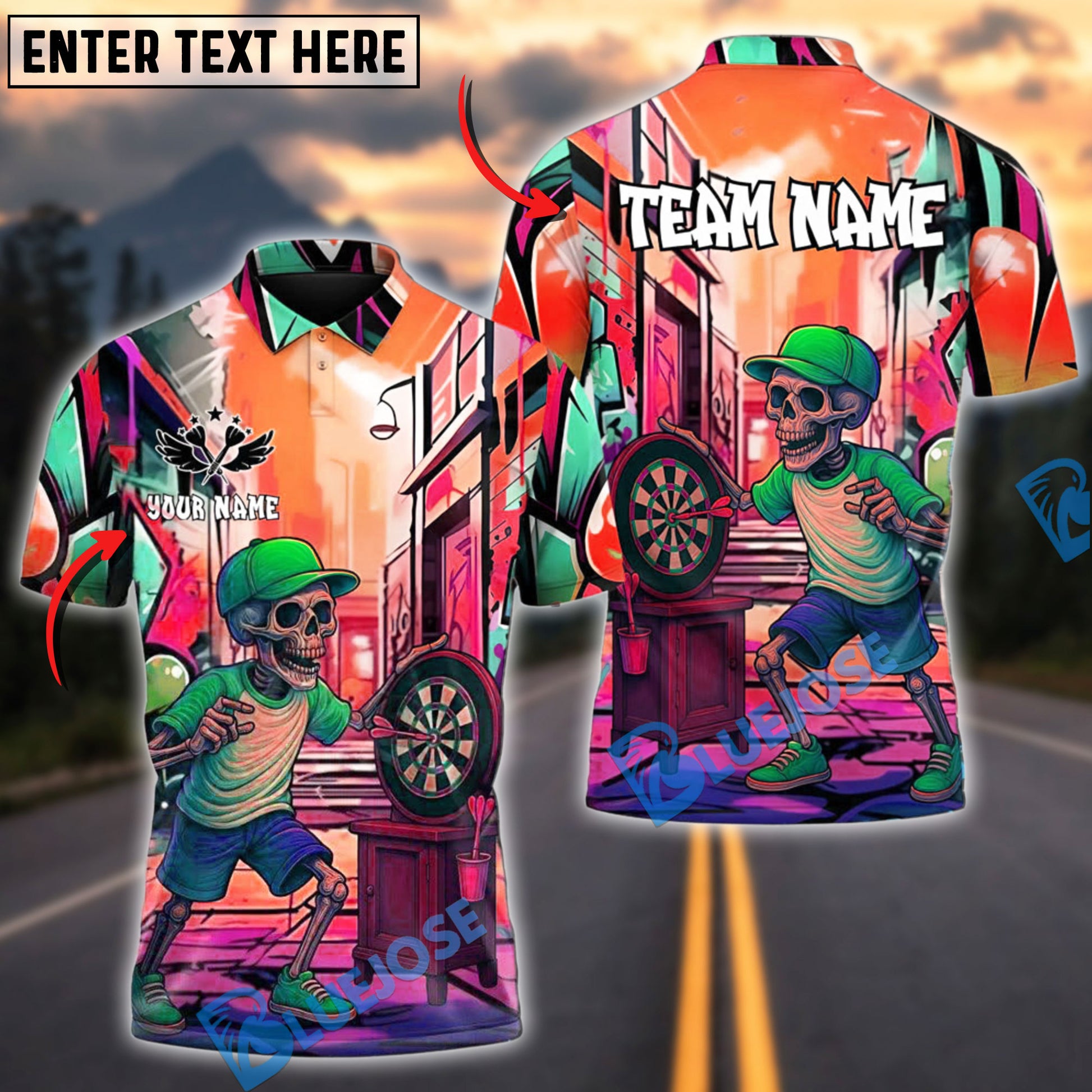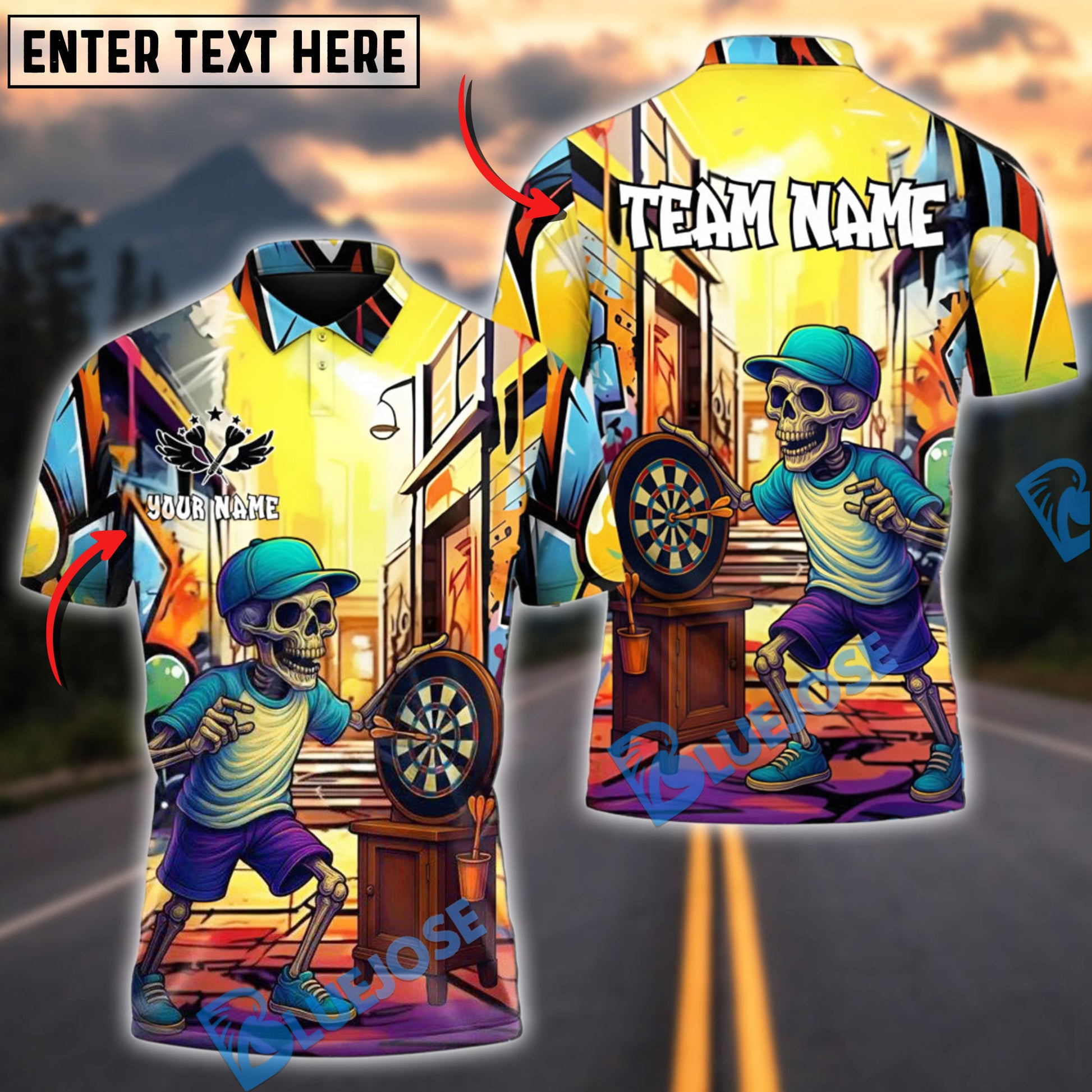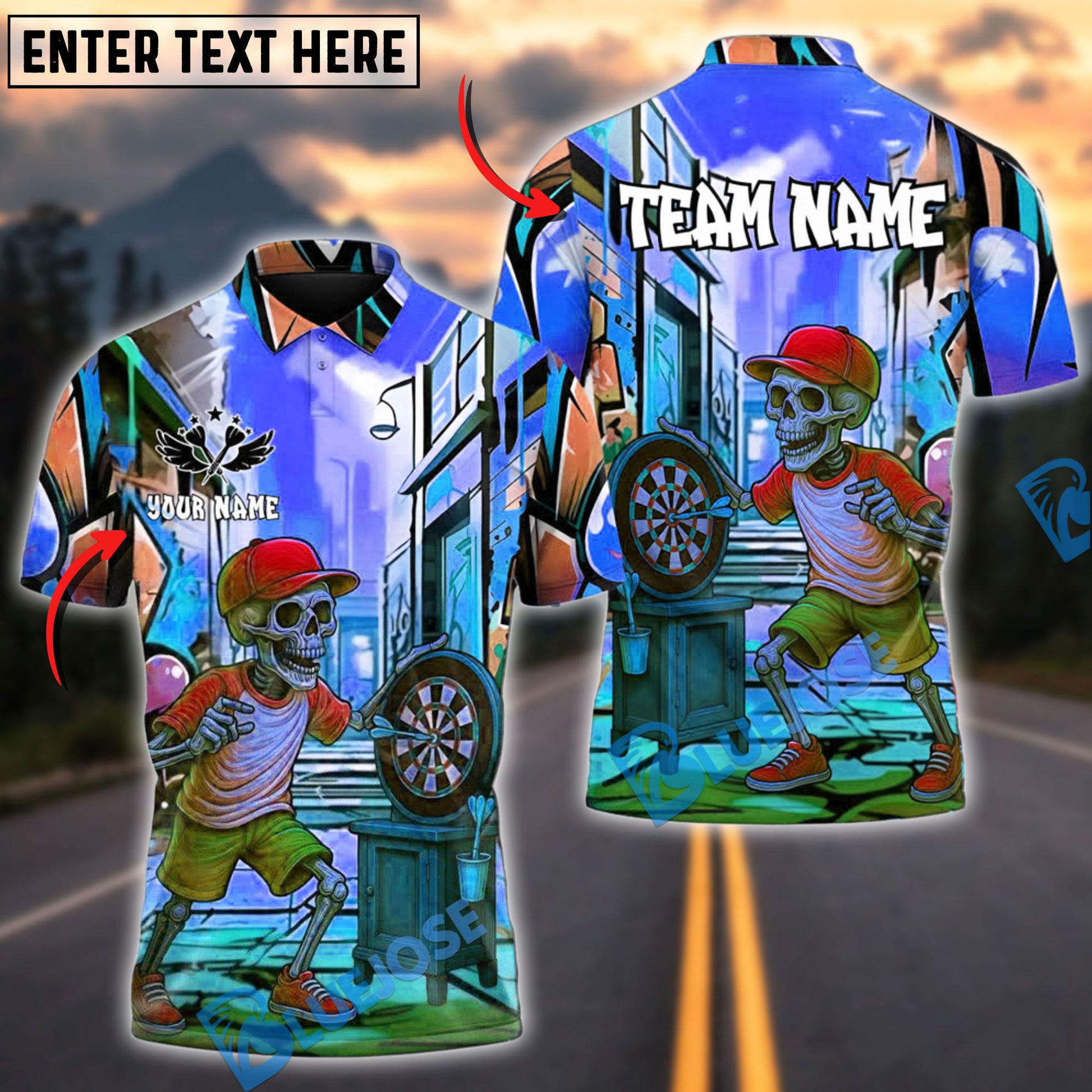 BlueJose Darts Urban Skeleton Dartboard Personalized Name, Team Name Shirt (4 Colors)