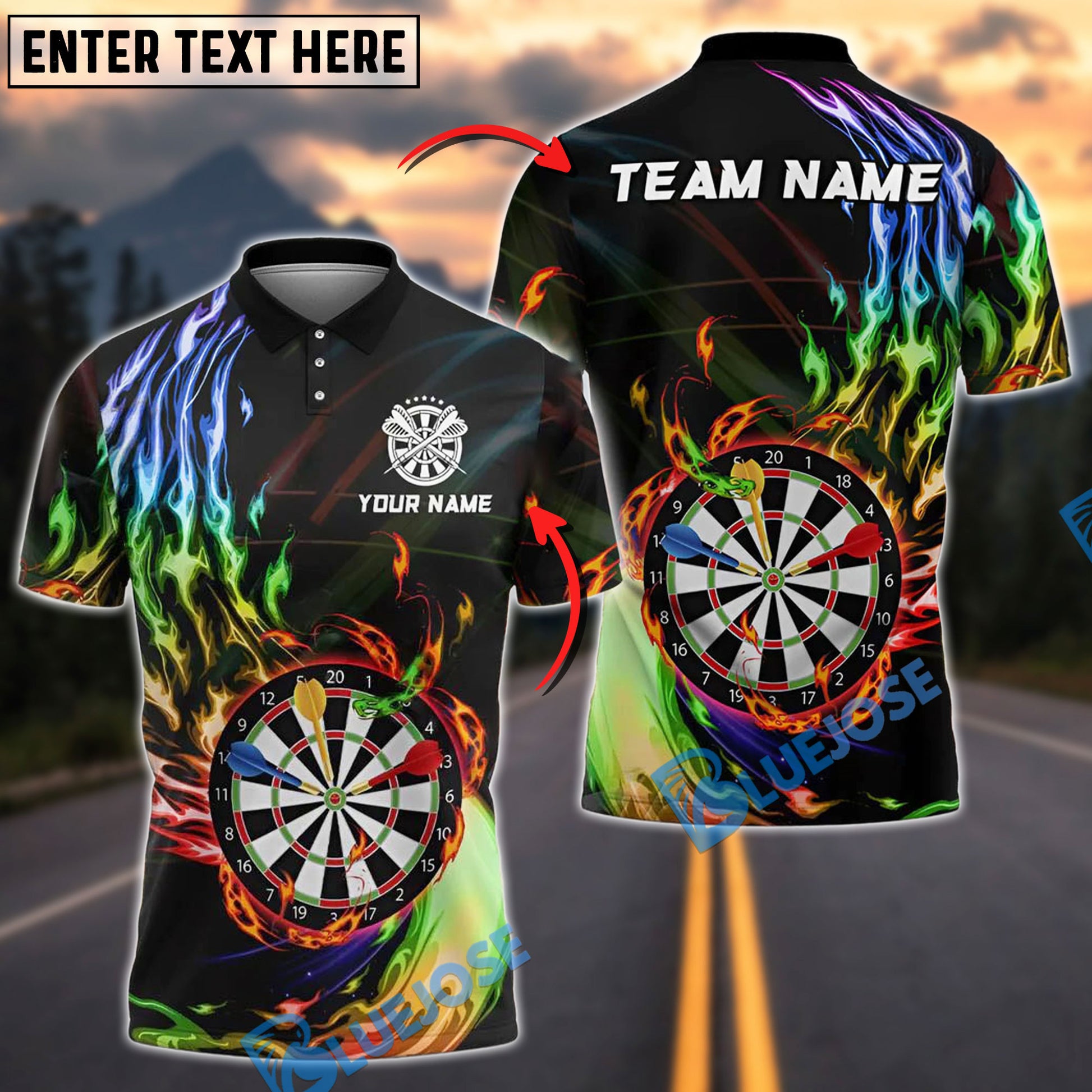 BlueJose Fire Darts Flame Rainbow Color Personalized Name, Team Name Shirt
