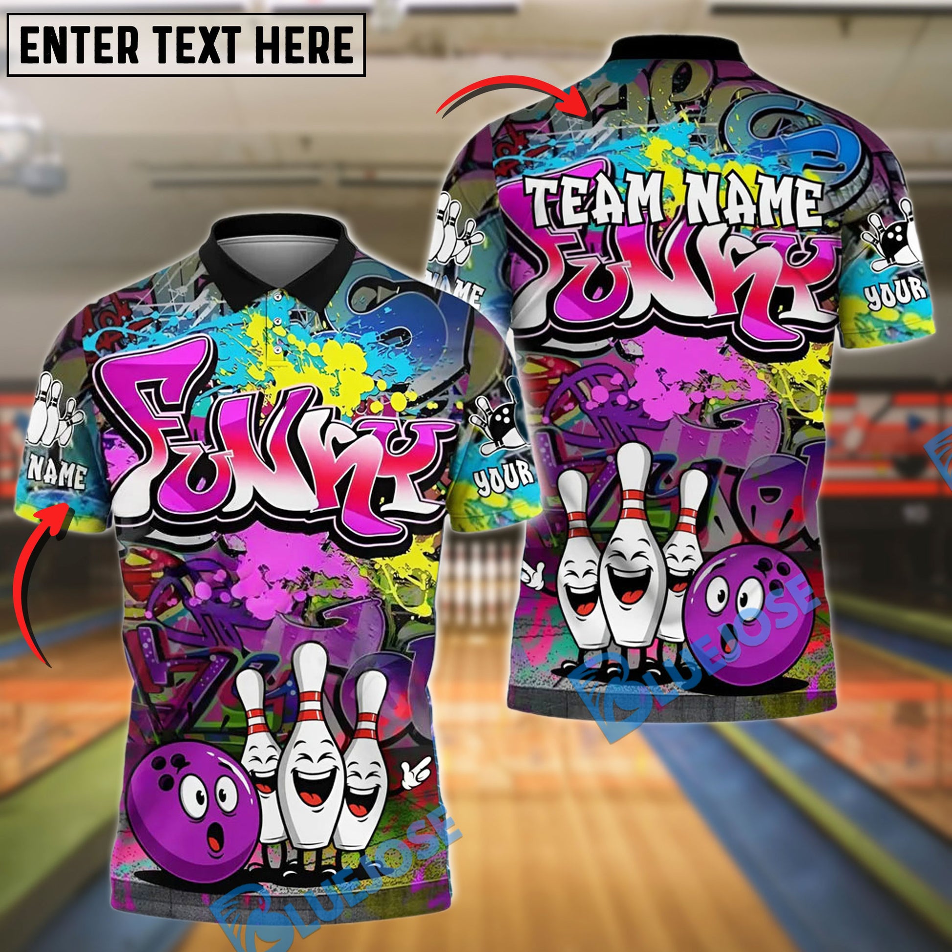 BlueJose Funny Graffiti Bowling Crew Customized Name, Team Name 3D Shirt (4 Colors)