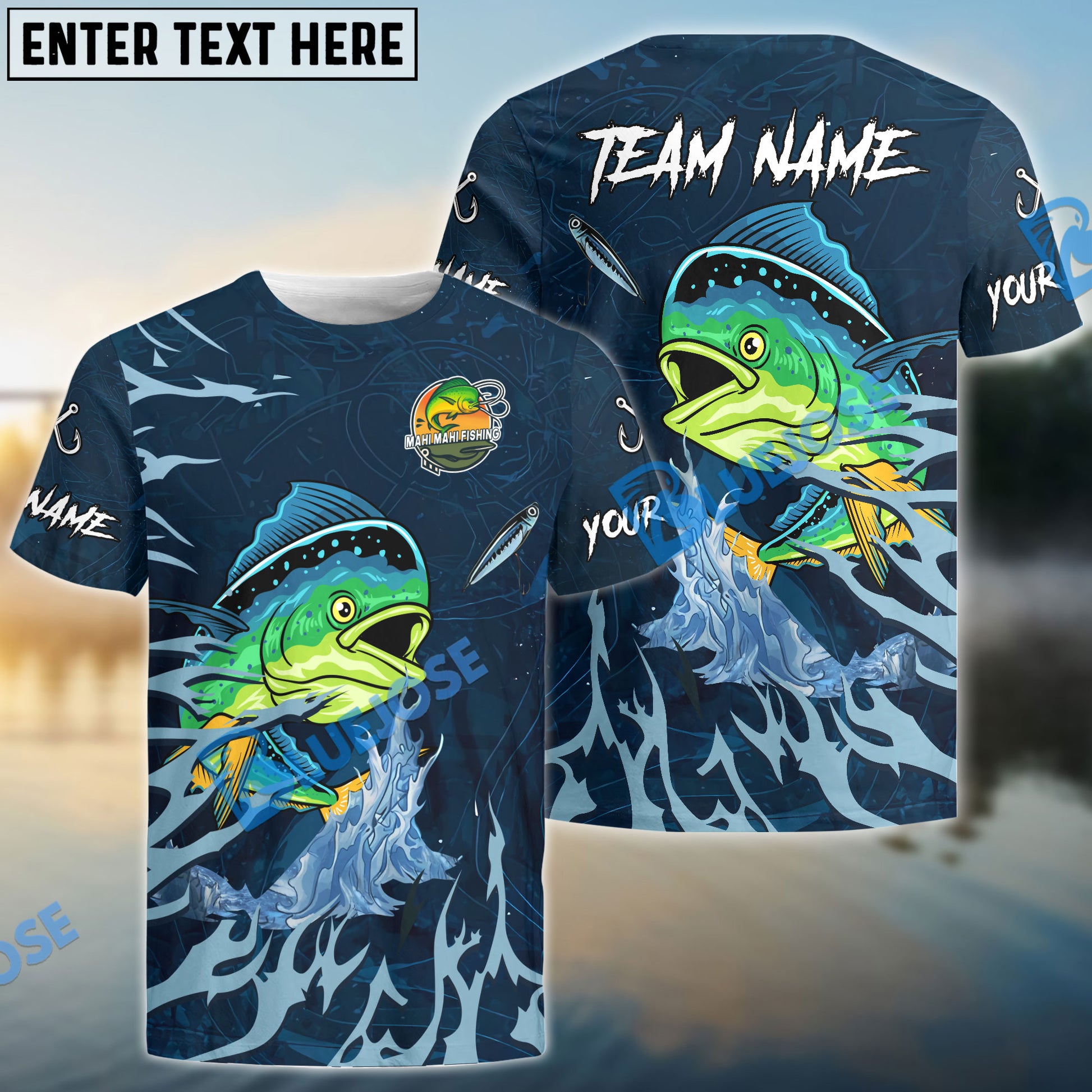 Bluejose Mahi-Mahi Fishing Navy Water Pattern Custom Name & Team Name 3D Shirts