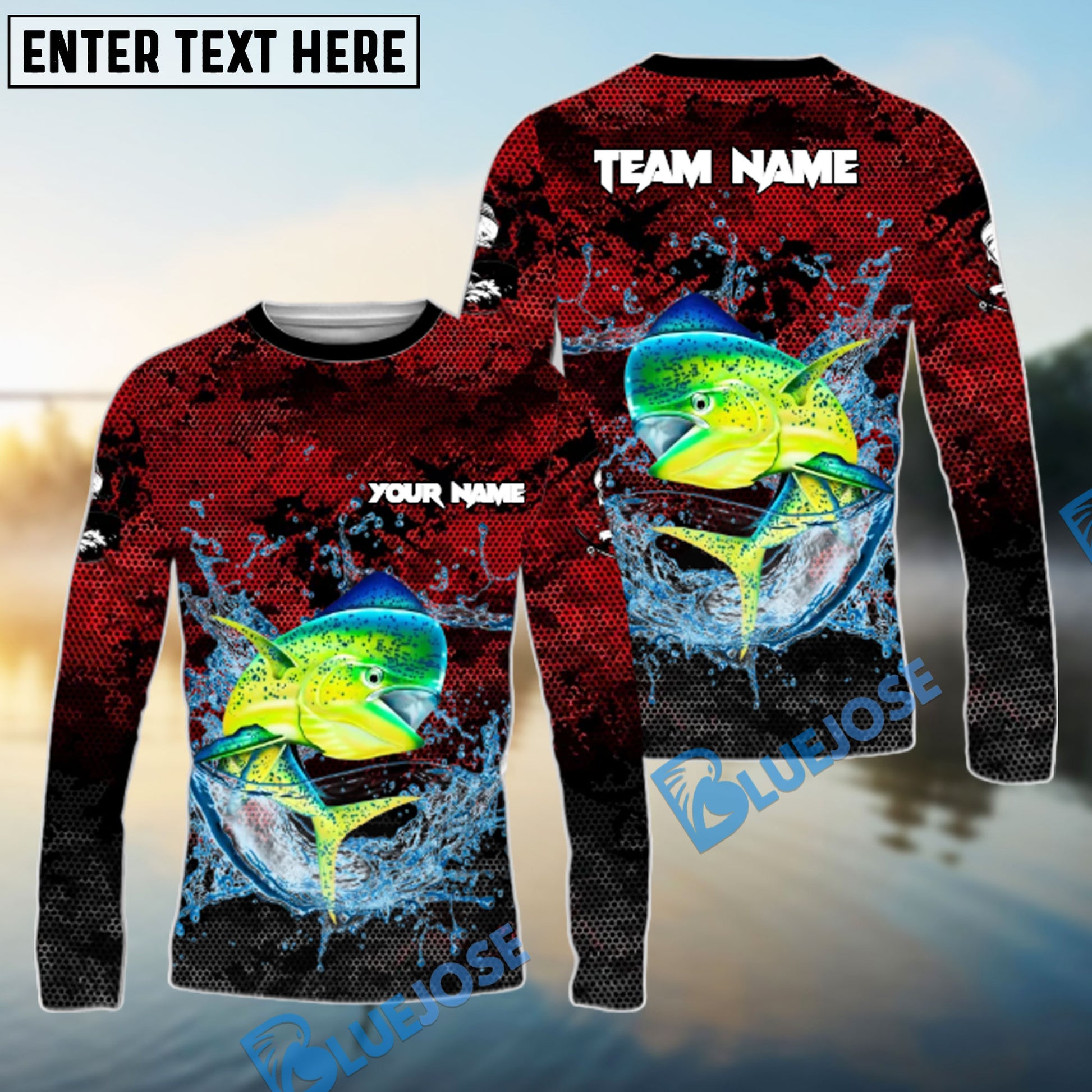 Bluejose Mahi Mahi Fishing Red Grunge Camo Design Name & Team Name 3D Shirts