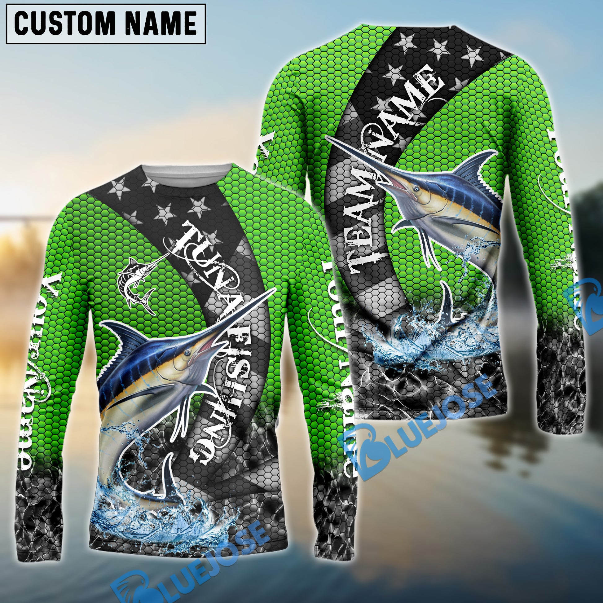 Bluejose Marlin Fishing American Flag Green Stars Custom Name & Team Name 3D Shirts