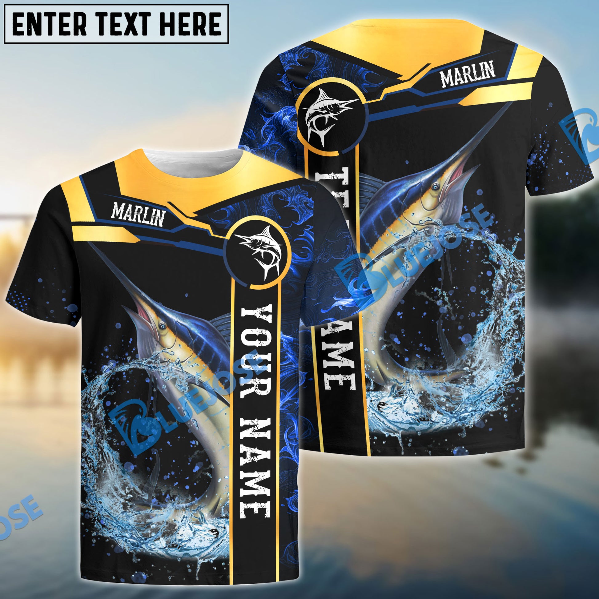 Bluejose Marlin Fishing Golden With Blue Flame Pattern Custom Name & Team Name 3D Shirts