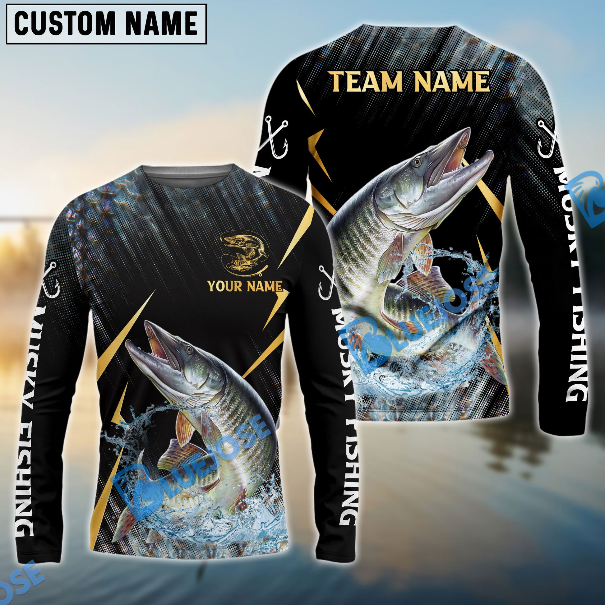 Bluejose Musky Fishing Golden With Skinfish Pattern Custom Name & Team Name 3D Shirts