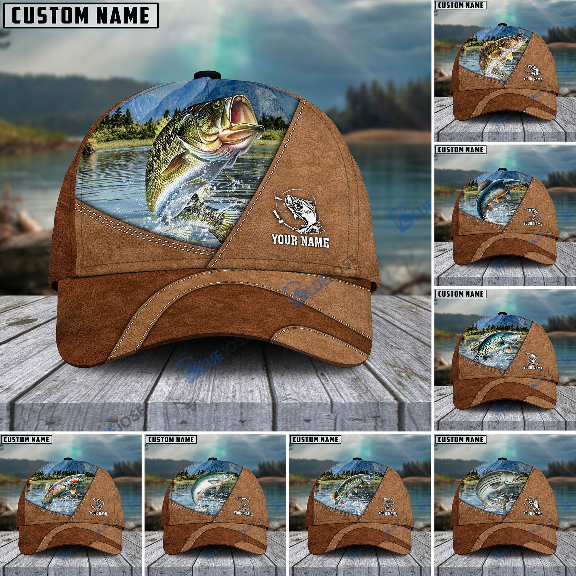 BlueJose Personalized Fishing Leather Pattern Cap (Bass, Striped Bass, Catfish, Trout, Crappie, Salmon, Walleye, Pike)