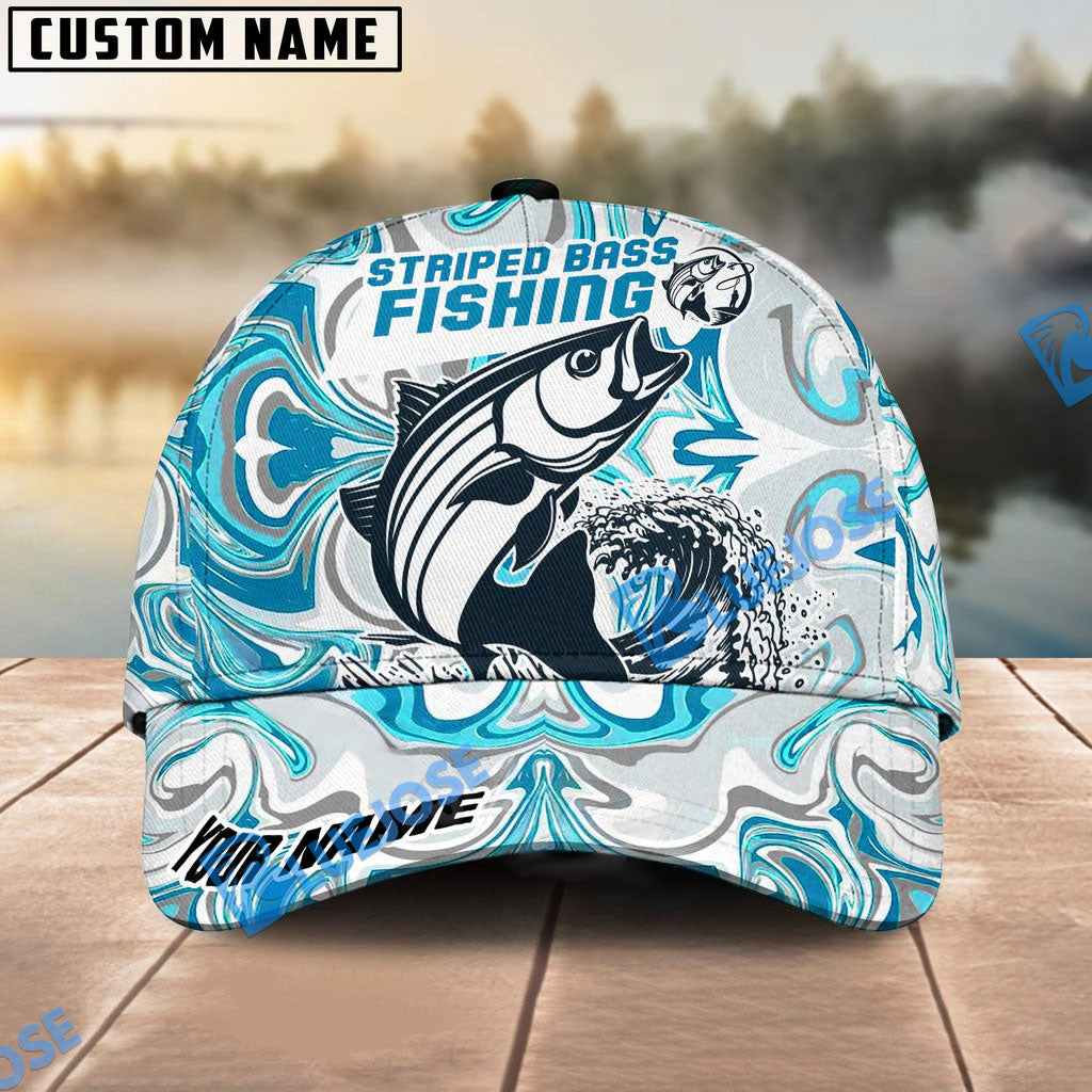 Bluejose Personalized Striped Bass Fishing Hat with Custom Name, Artistic Blue Water Pattern Cap, Unique Gift for Freshwater Anglers & Outdoor Fishermen