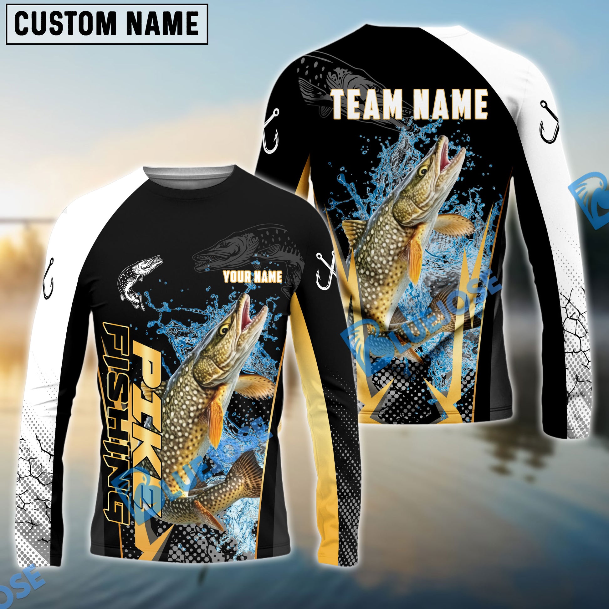 Bluejose Pike Fishing Black Gold Design Pattern Custom Name & Team Name 3D Shirts