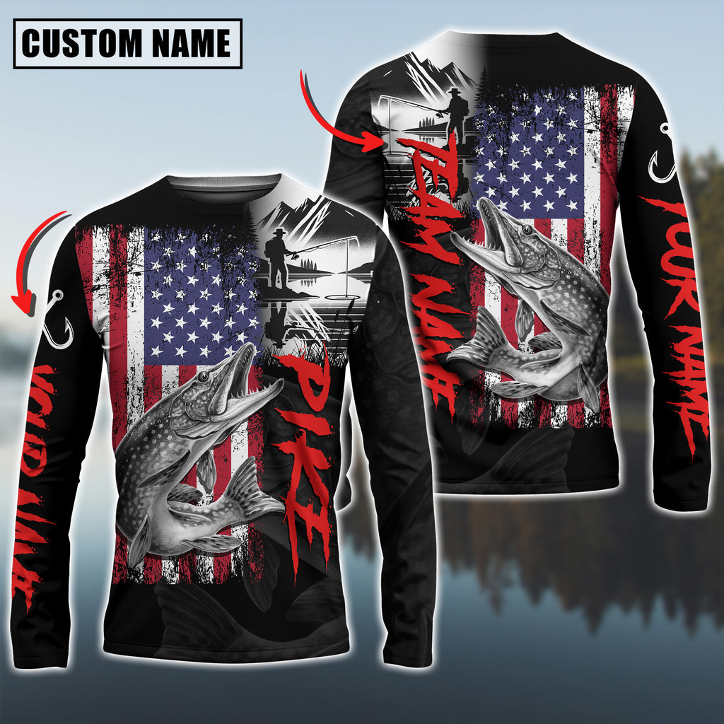 Bluejose Pike Fishing Black US Flag Sport Custom Name & Team Name 3D Shirts