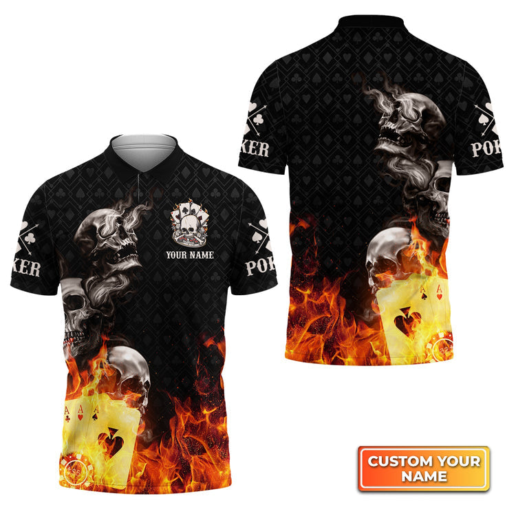 BlueJose Poker Four Of A Kind Aces Skull On Fire Personalized Name 3D Polo Shirt