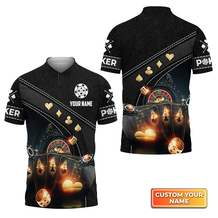 BlueJose Poker Quad Aces Black Leather Personalized Name 3D Polo Shirt