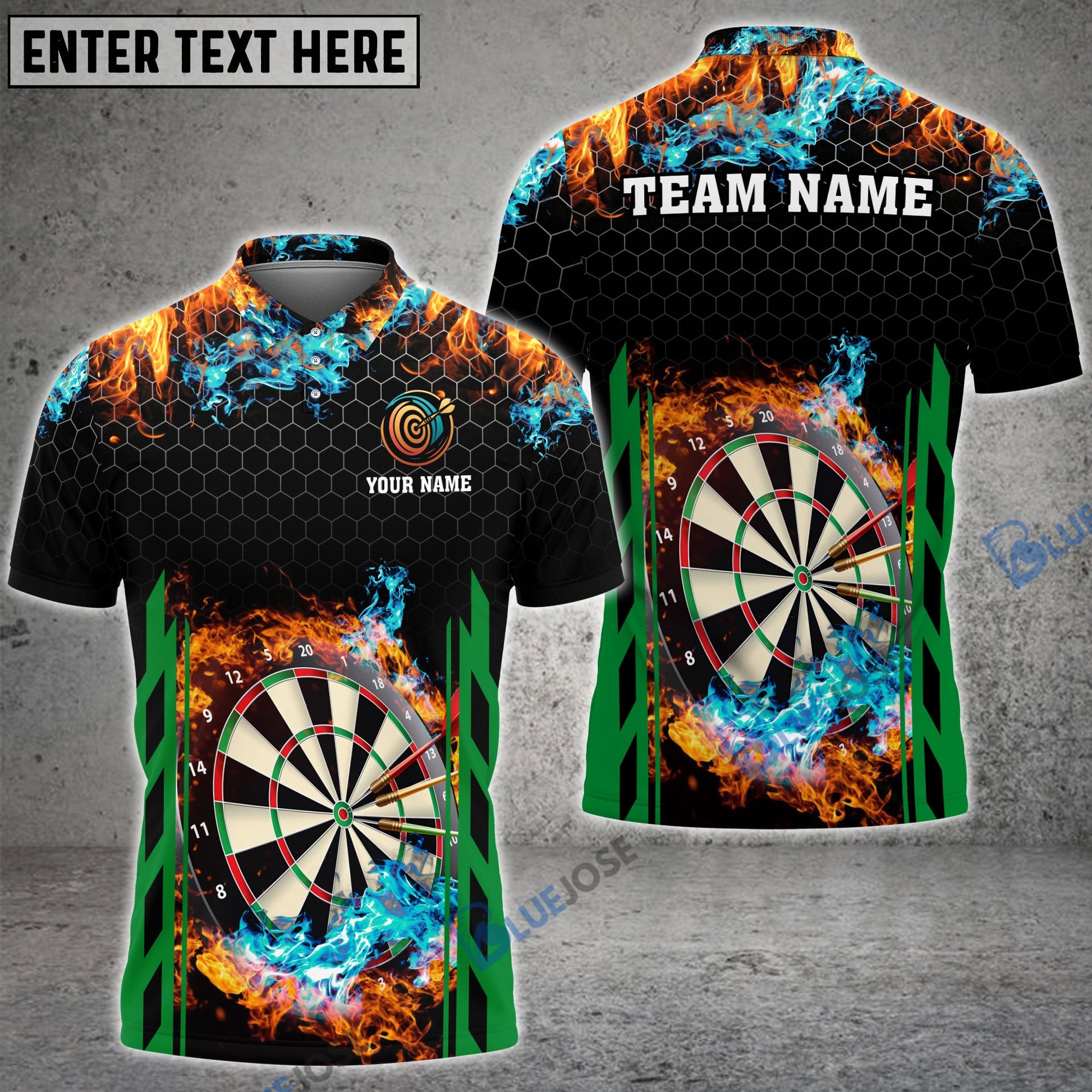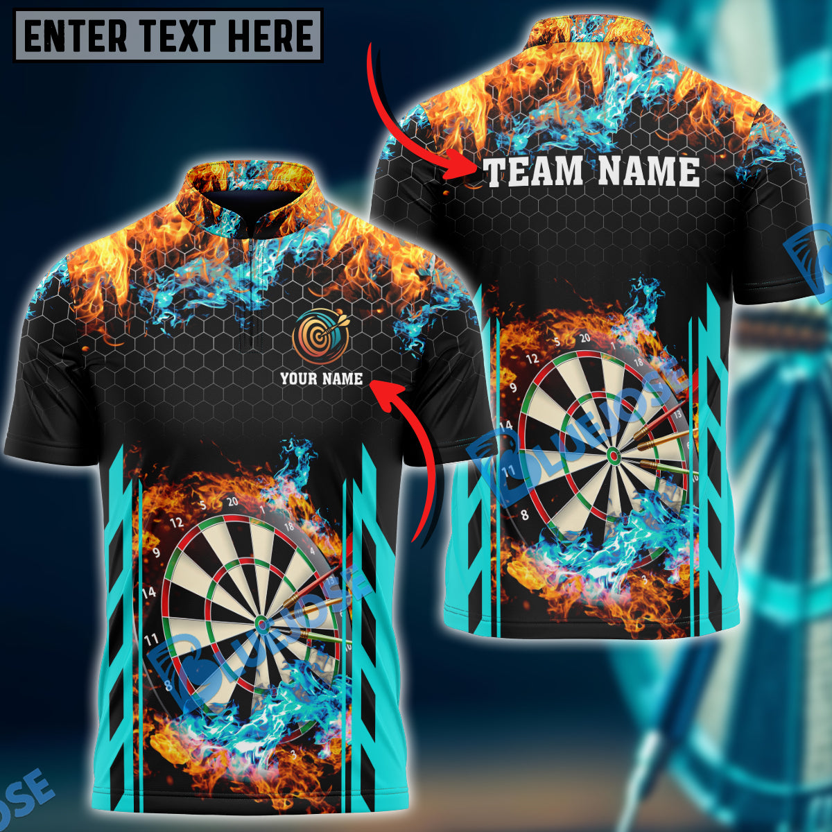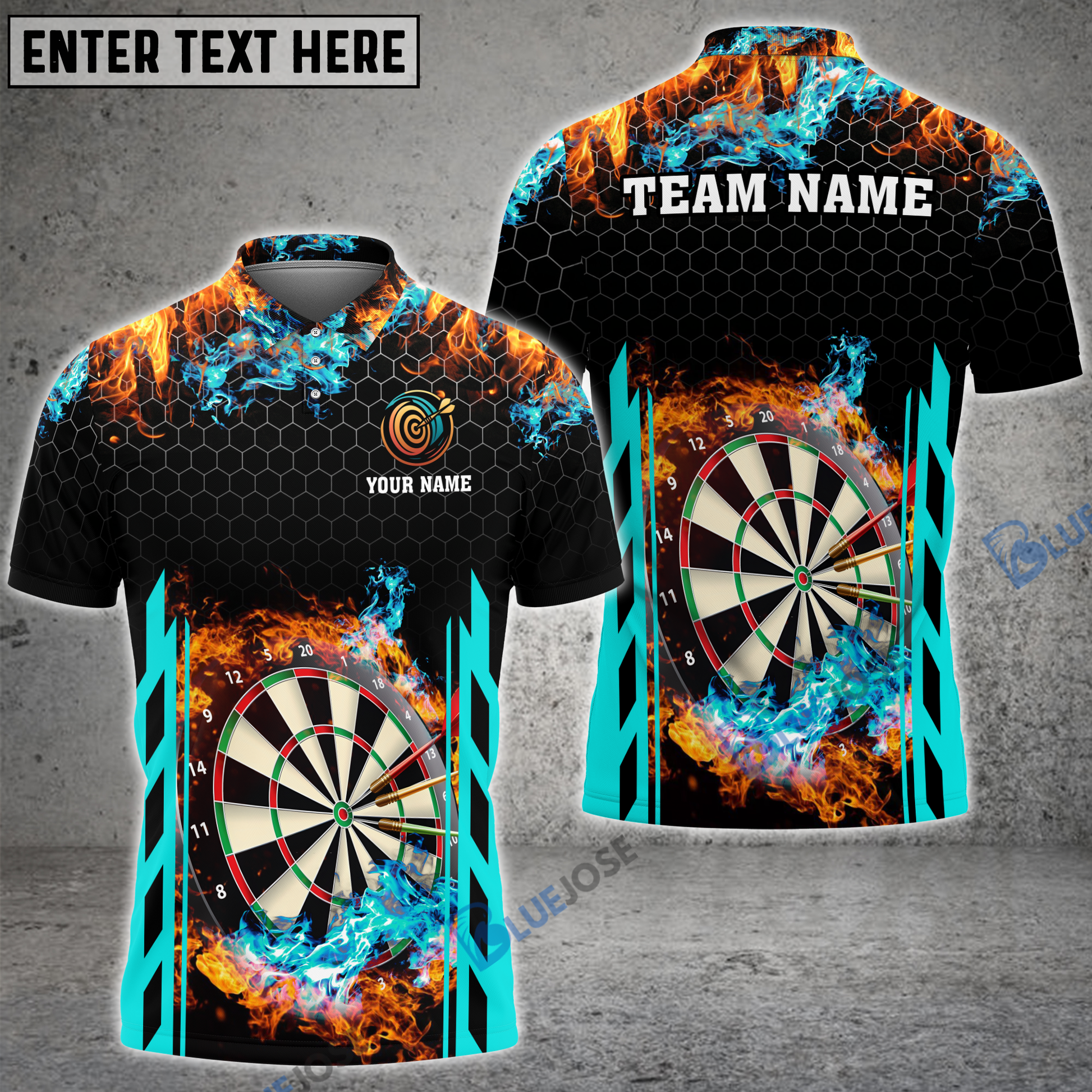 BlueJose Red and Blur Fire Dart Board Personalized Name, Team Name Shirt (6 Colors)